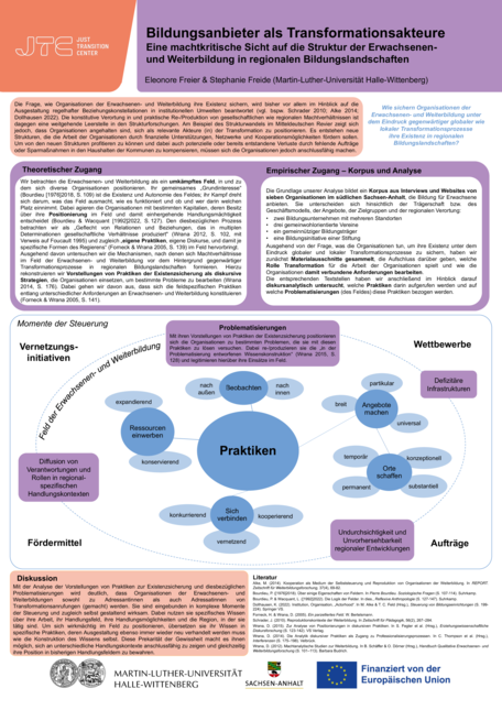 Mit dem ersten Preis (dotiert mit 300,- Euro) wurden Eleonore Freier und Stephanie Freide von der Martin-Luther-Universität Halle-Wittenberg ausgezeichnet. Mit ihrem Poster „Bildungsanbieter als Transformationsakteure – Eine machtkritische Sicht auf die Struktur der Erwachsenen- und Weiterbildung in regionalen Bildungslandschaften“ stellten sie Fragen nach Macht, Verantwortung und Gestaltungsspielräumen in Bildungsnetzwerken, die den Nerv aktueller Debatten treffen (Abbildung s.u.).