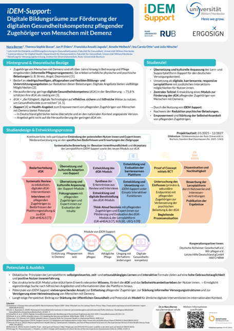 Auf den zweiten Platz (200,- Euro) wählte die Jury die Arbeit „iDEM-Support: Digitale Bildungsräume zur Förderung der digitalen Gesundheitskompetenz pflegender Zugehöriger von Menschen mit Demenz“. Das interdisziplinäre Team um Nora Berner, Theresa Sophie Busse, Jan P. Ehlers, Franziska Anushi Jagoda, Amelie Meibeck, Ina Otte und Julia Nitsche von der Universität Witten/Herdecke und der Ruhr-Universität Bochum überzeugte mit einem innovativen Ansatz, wie digitale Plattformen pflegende Angehörige unterstützen können (Abbildung s.u.).