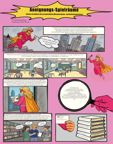 Der dritte Preis (100,- Euro) ging an Hannah Rosenberg von der Universität Koblenz, die mit ihrem Poster „Aneignungs-Spielräume: Comics als Anlässe für ko-konstruktive Wissenstransferprozesse“ eindrucksvoll zeigte, wie kreative Formate Lern- und Dialogprozesse anstoßen können (Abbildung s.u.).