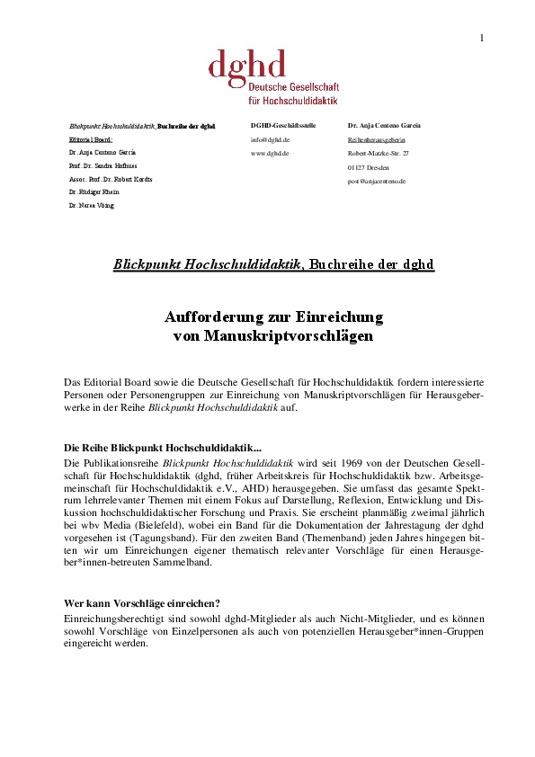 Zur Sicherstellung einer klaren Fokussierung und multiperspektivischen Abbildung des in der Publikation behandelten Themas muss der eingereichte Vorschlag einen deutlich erkennbaren Bezug zum Themengebiet Hochschullehre aufweisen und dieses aus multiplen Perspektiven reflektiert werden. Darüber hinaus ist es erwünscht, dass die Publikation diskursive Elemente (Formen der Kommentierung, Stellungnahmen, andauernde Diskussionen) beinhaltet, die zur eigenen Reflexion über die Themen anregen.