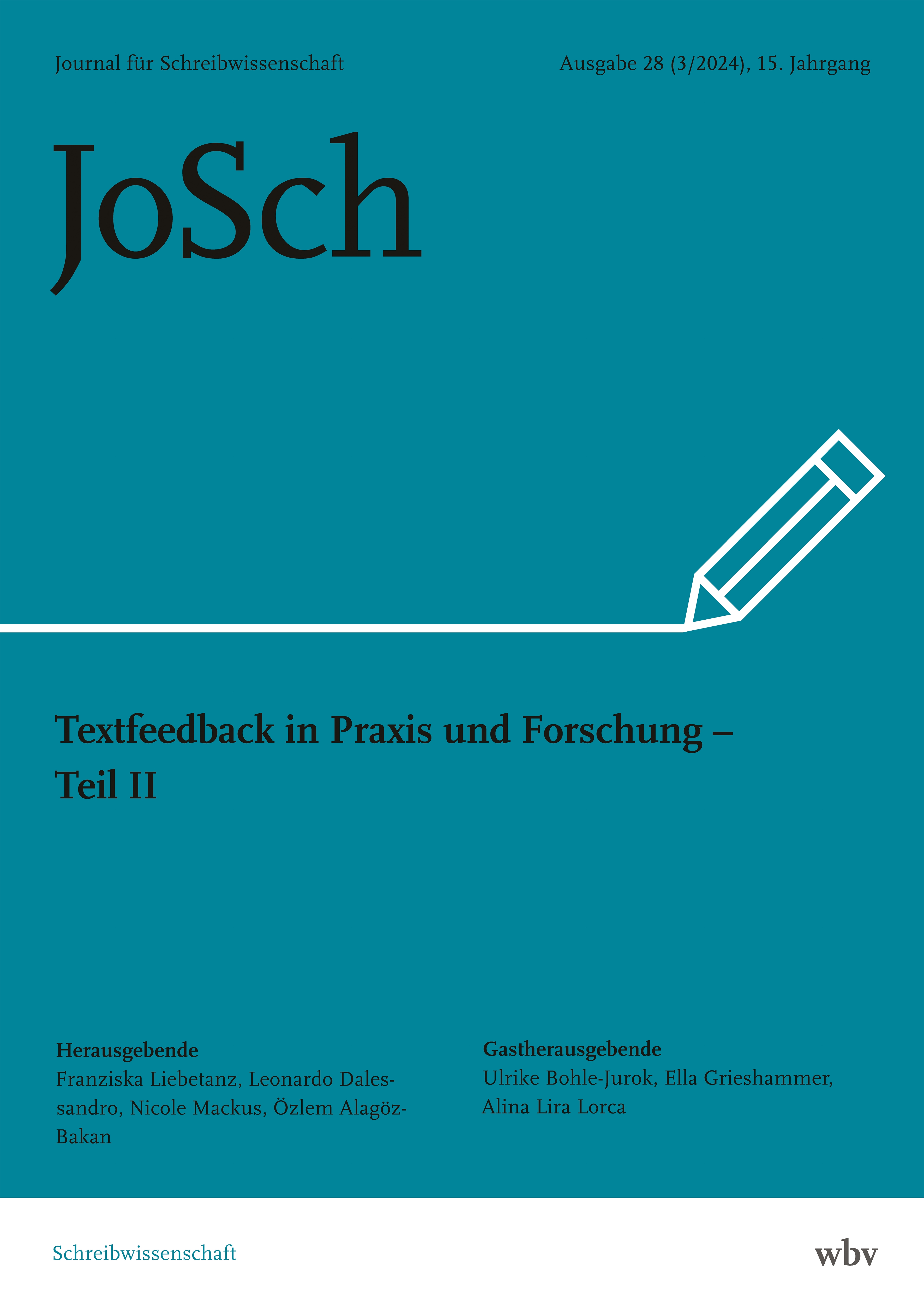 Liebetanz, F., Dalessandro, L., Mackus, N. & Alagöz-Bakan, Ö. (2024). Textfeedback in Praxis und Forschung - Teil II. JoSch-Journal für Schreibwissenschaft, 15(3). Bielefeld: wbv Publikation. DOI: https://doi.org/10.3278/JOS2403W