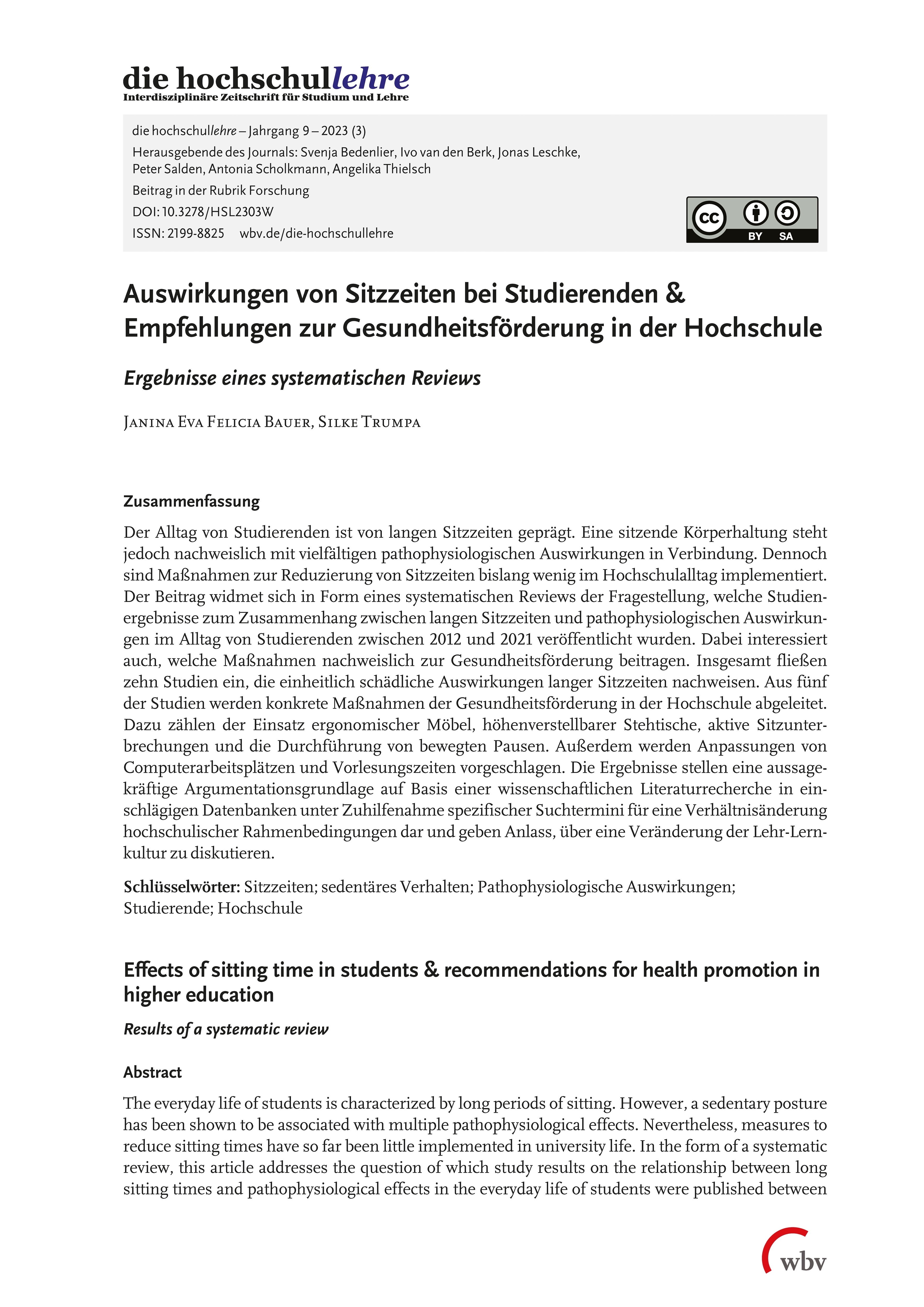 Bauer, J. E. F. & Trumpa, S. (2023). Auswirkungen von Sitzzeiten bei Studierenden & Empfehlungen zur Gesundheitsförderung in der Hochschule. die hochschullehre, Jahrgang 9/2023. DOI: 10.3278/HSL2303W.