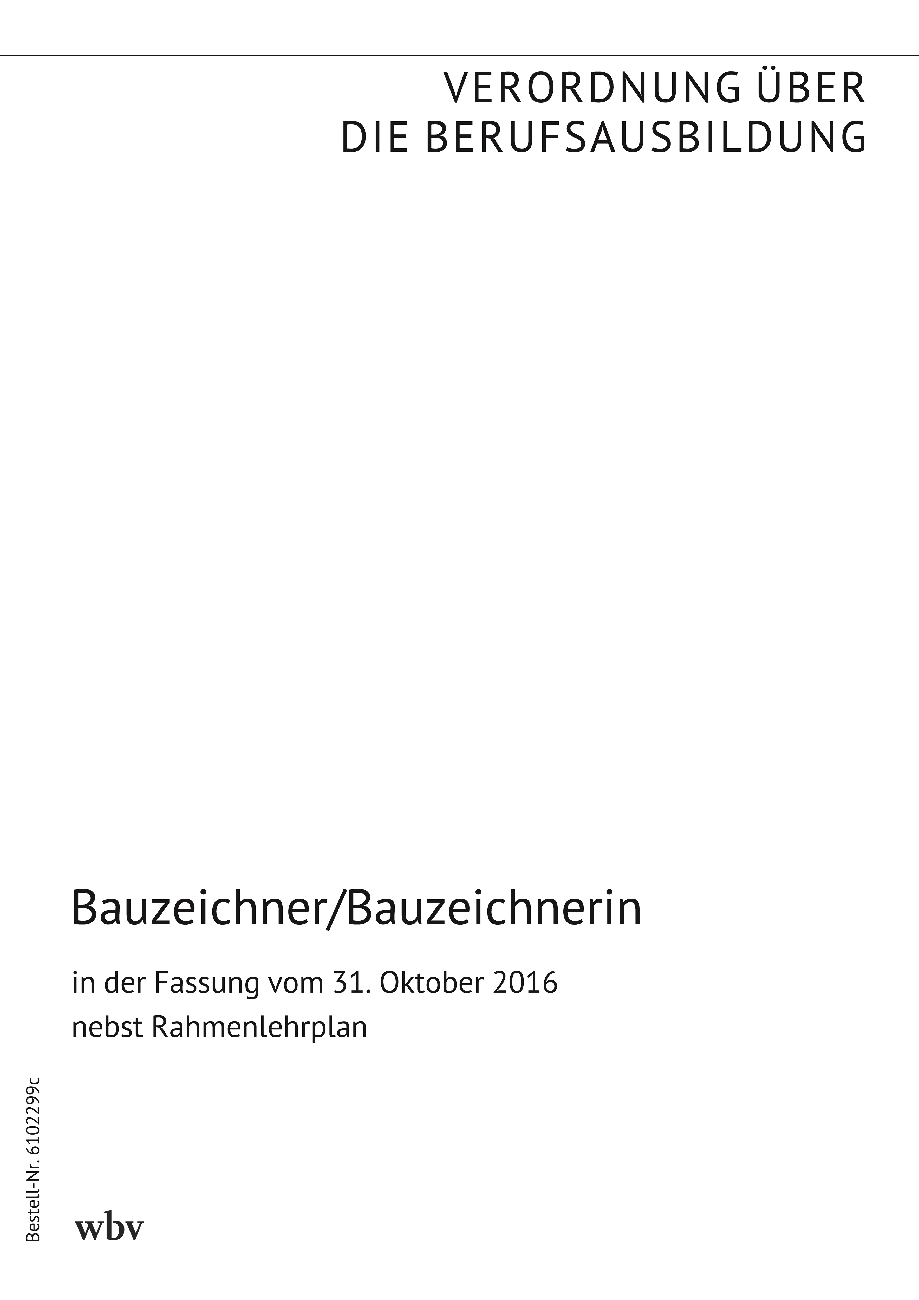 Verordnung über die Berufsausbildung zum Bauzeichner/zur Bauzeichnerin vom 12. Juli 2002 (BGBl. I S. 2622 vom 17. Juli 2002) nebst Rahmenlehrplan (Beschluss der Kultusministerkonferenz vom 14. Juni 2002), zuletzt geändert durch die Verordnung vom 31. Oktober 2016 (BGBl. I S. 2493 vom 9. November 2016).