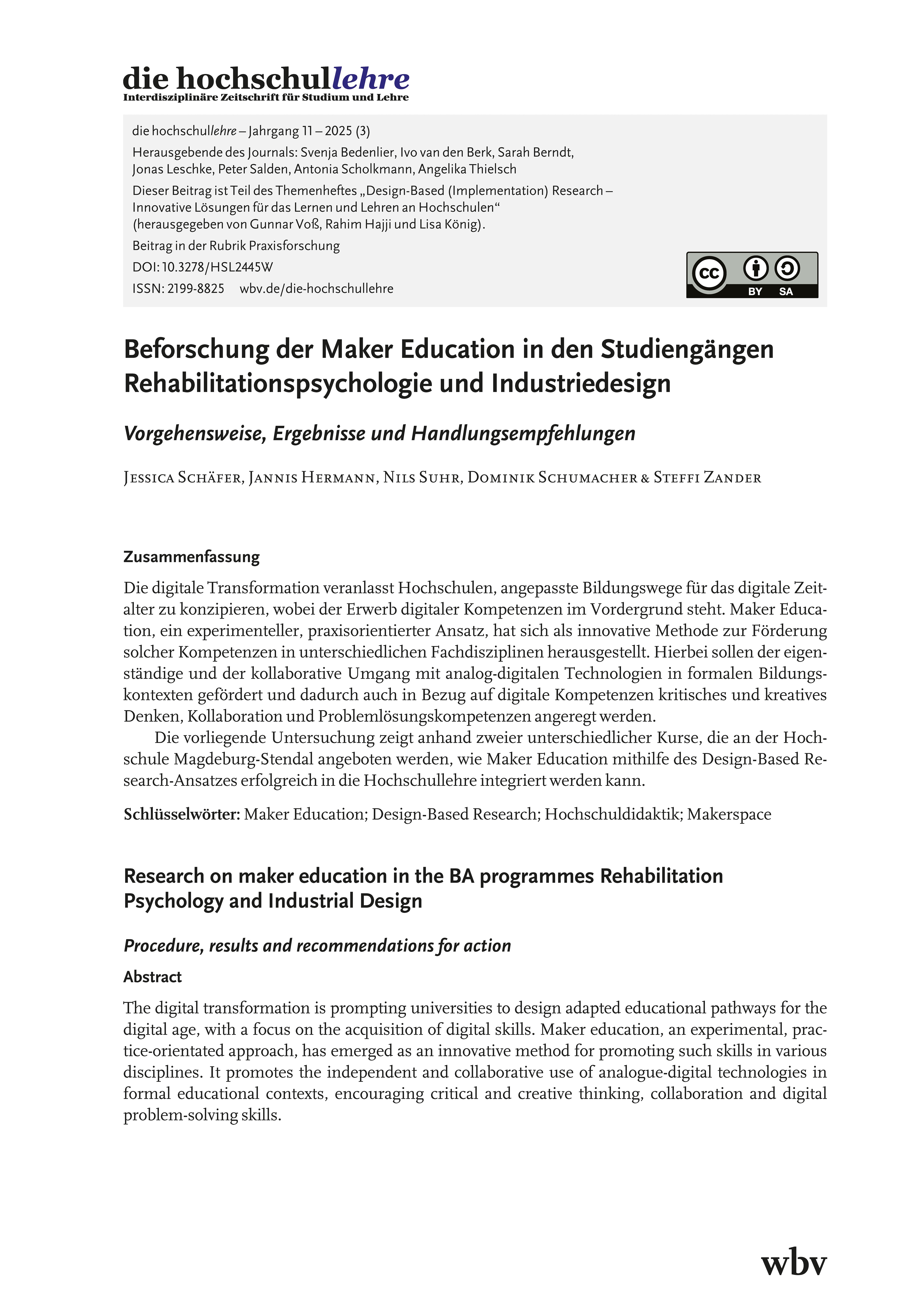 Schäfer, J., Hermann, J., Suhr, N., Schumacher, D. & Zander, S. (2025). Beforschung der Maker Education in den Studiengängen Rehabilitationspsychologie und Industriedesign. die hochschullehre, Jahrgang 11/2025. DOI: 10.3278/HSL2445W.