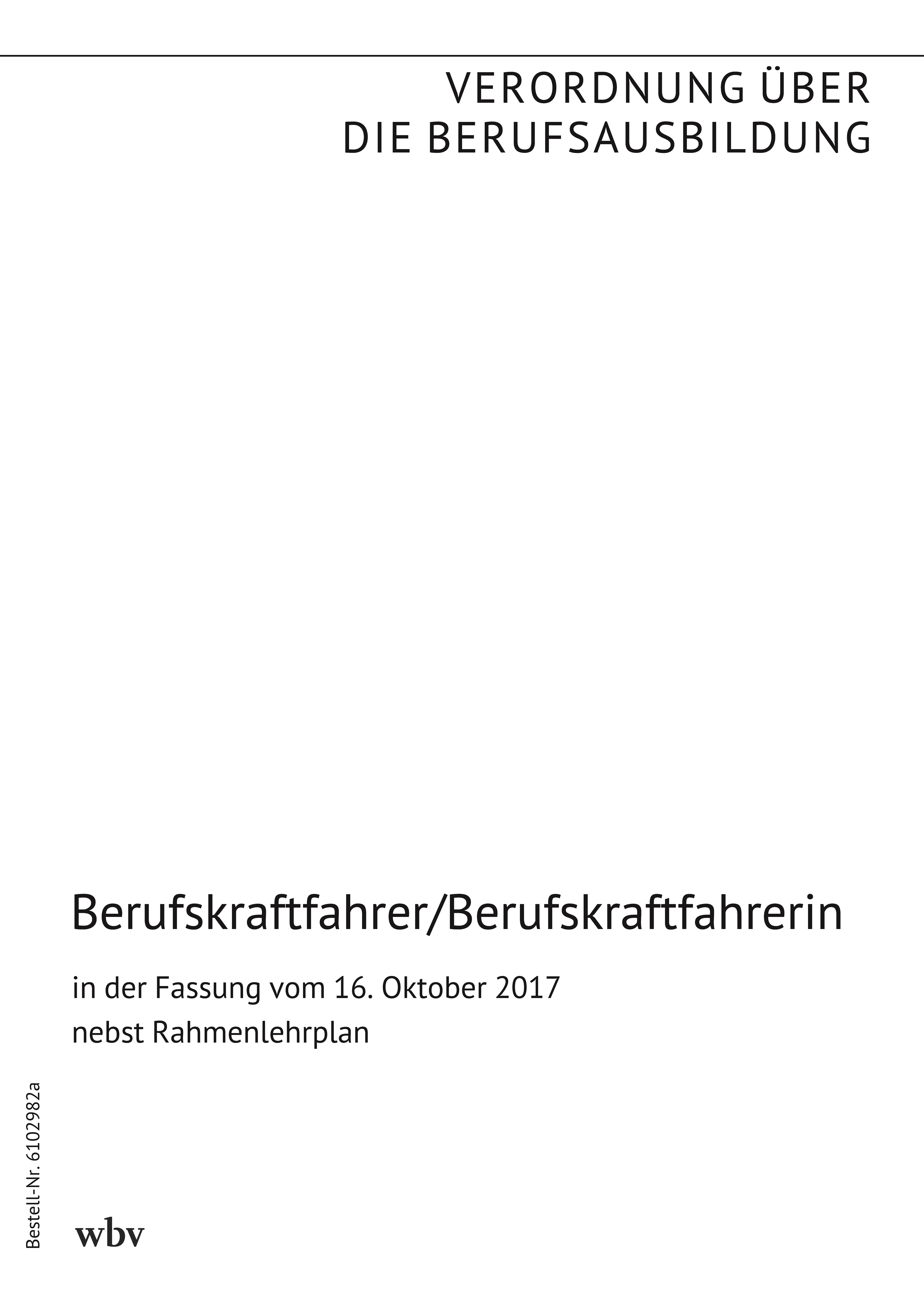 Verordnung über die Berufsausbildung zum Berufskraftfahrer und zur Berufskraftfahrerin (Berufskraftfahrer-Ausbildungsverordnung) vom 19. April 2001 (BGBl. I S. 642 vom 27. April 2001), zuletzt geändert durch die Verordnung vom 16. Oktober 2017 (BGBl. I S. 3564 vom 23. Oktober 2017) nebst Rahmenlehrplan für den Ausbildungsberuf Berufskraftfahrer/Berufskraftfahrerin (Beschluss der Kultusministerkonferenz vom 1. Dezember 2000)