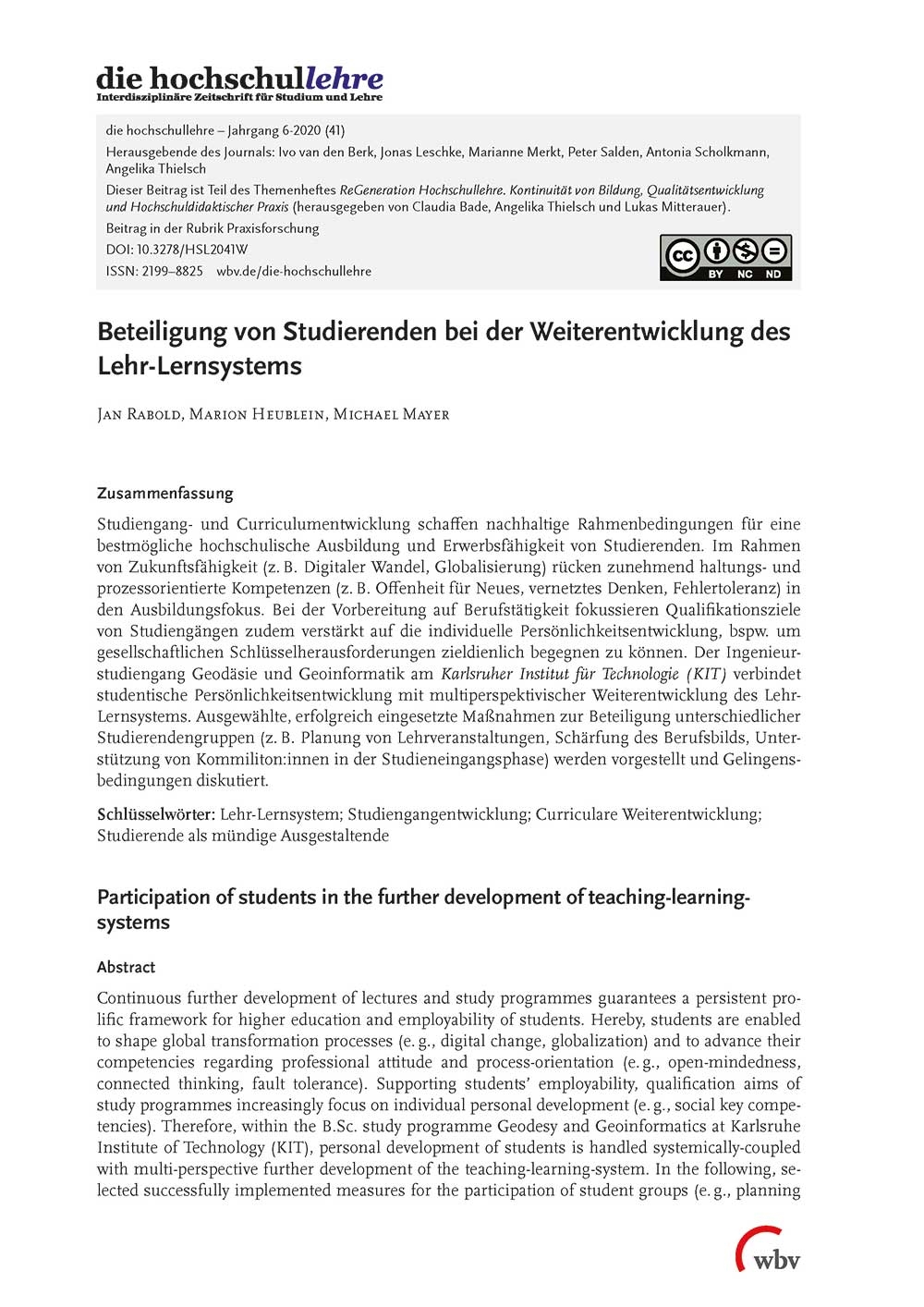 Rabold, J., Heublein, M. & Mayer, M. (2020). Beteiligung von Studierenden bei der Weiterentwicklung des Lehr-Lernsystems. die hochschullehre, Jahrgang 6/2020. DOI: 10.3278/HSL2041W.