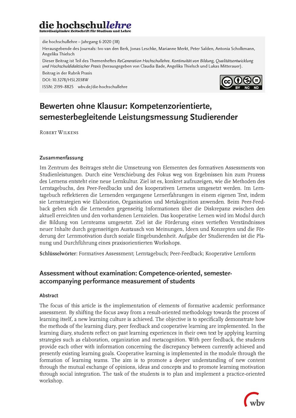 Wilkens, R. (2020). Bewerten ohne Klausur: Kompetenzorientierte, semesterbegleitende Leistungsmessung Studierender. die hochschullehre, Jahrgang 6/2020. DOI: 10.3278/HSL2038W.