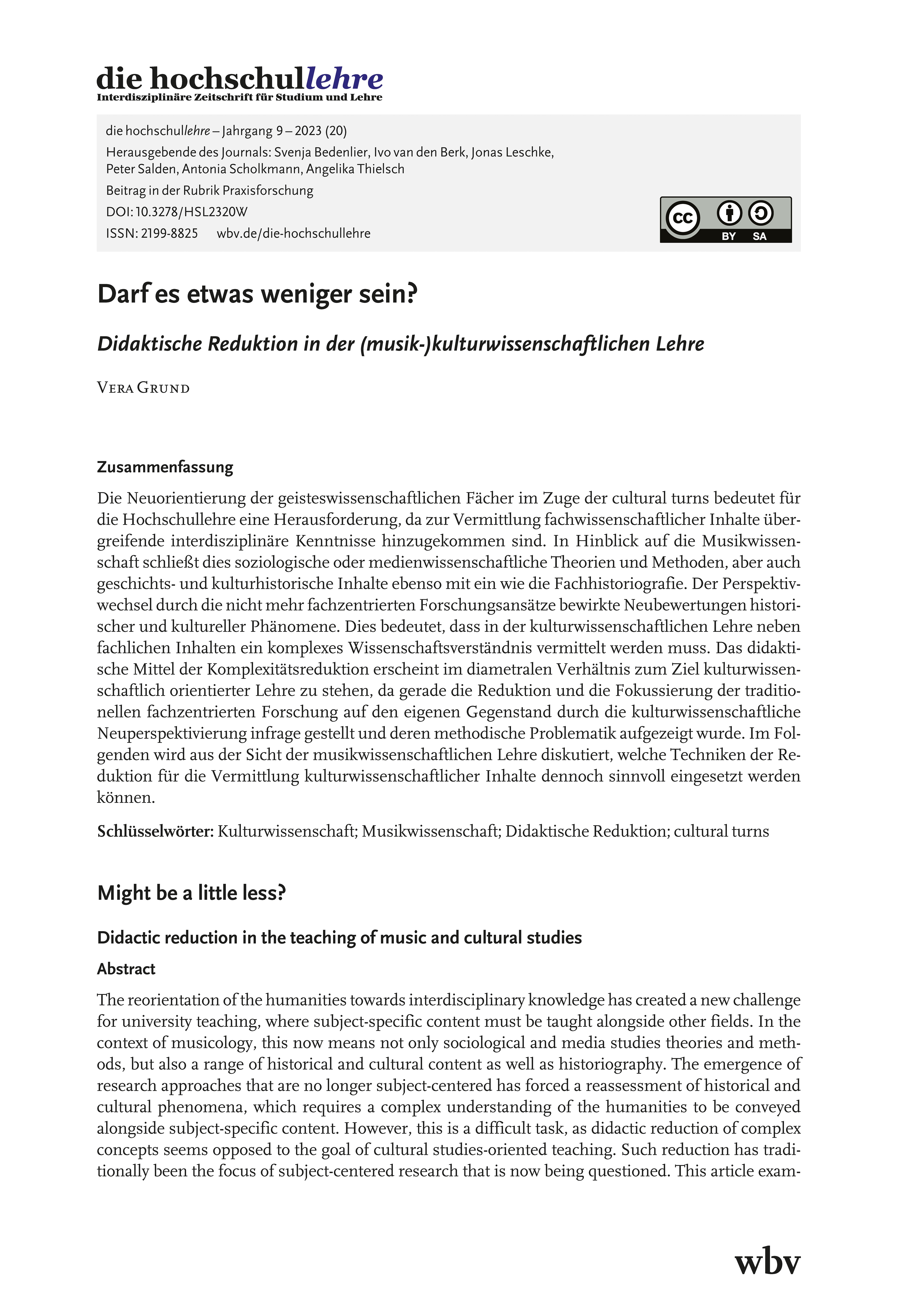 Grund, V. (2023). Darf es etwas weniger sein? Didaktische Reduktion in der (musik-)kulturwissenschaftlichen Lehre. die hochschullehre, Jahrgang 9/2023. DOI: 10.3278/HSL2320W.