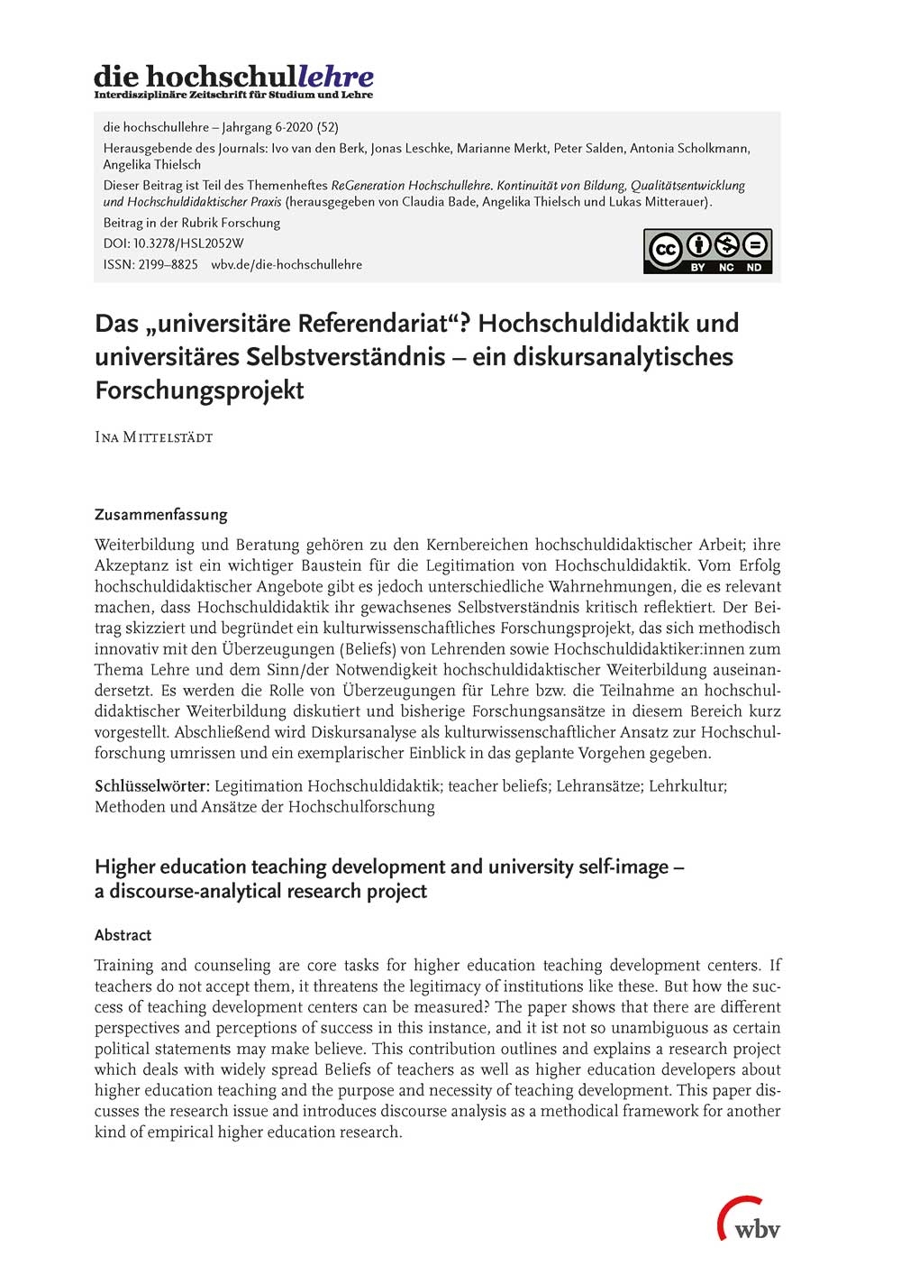 Mittelstädt, I. (2020). Das „universitäre Referendariat"? Hochschuldidaktik und universitäres Selbstverständnis - ein diskursanalytisches Forschungsprojekt. die hochschullehre, Jahrgang 6/2020. DOI: 10.3278/HSL2052W.