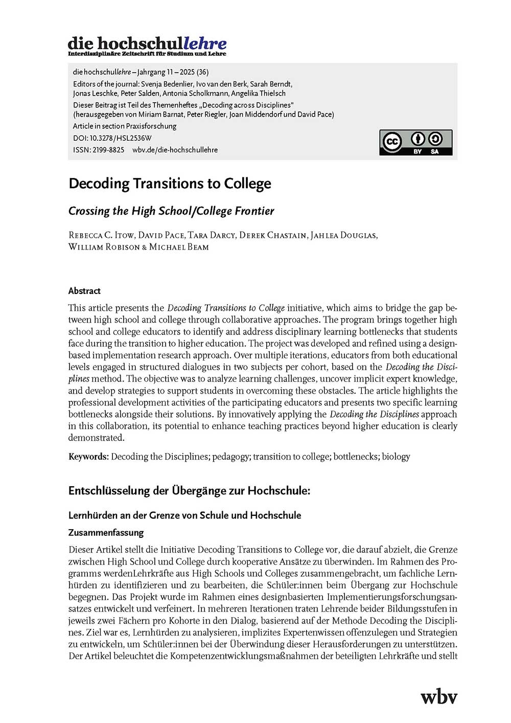 Itow, R. C., Pace, D., Darcy, T., Chastain, D., Douglas, J., Robison, W., & Beam, M. (2025). Decoding Transitions to College: Crossing the High School/College Frontier. die hochschullehre, Jahrgang 11/2025. DOI: 10.3278/HSL2536W.