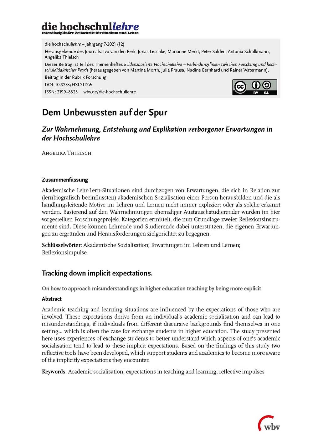 Thielsch, A. (2021). Dem Unbewussten auf der Spur. Zur Wahrnehmung, Entstehung und Explikation verborgener Erwartungen in der Hochschullehre. die hochschullehre, Jahrgang 7/2021. Bielefeld: wbv. DOI: 10.3278/HSL2112W.