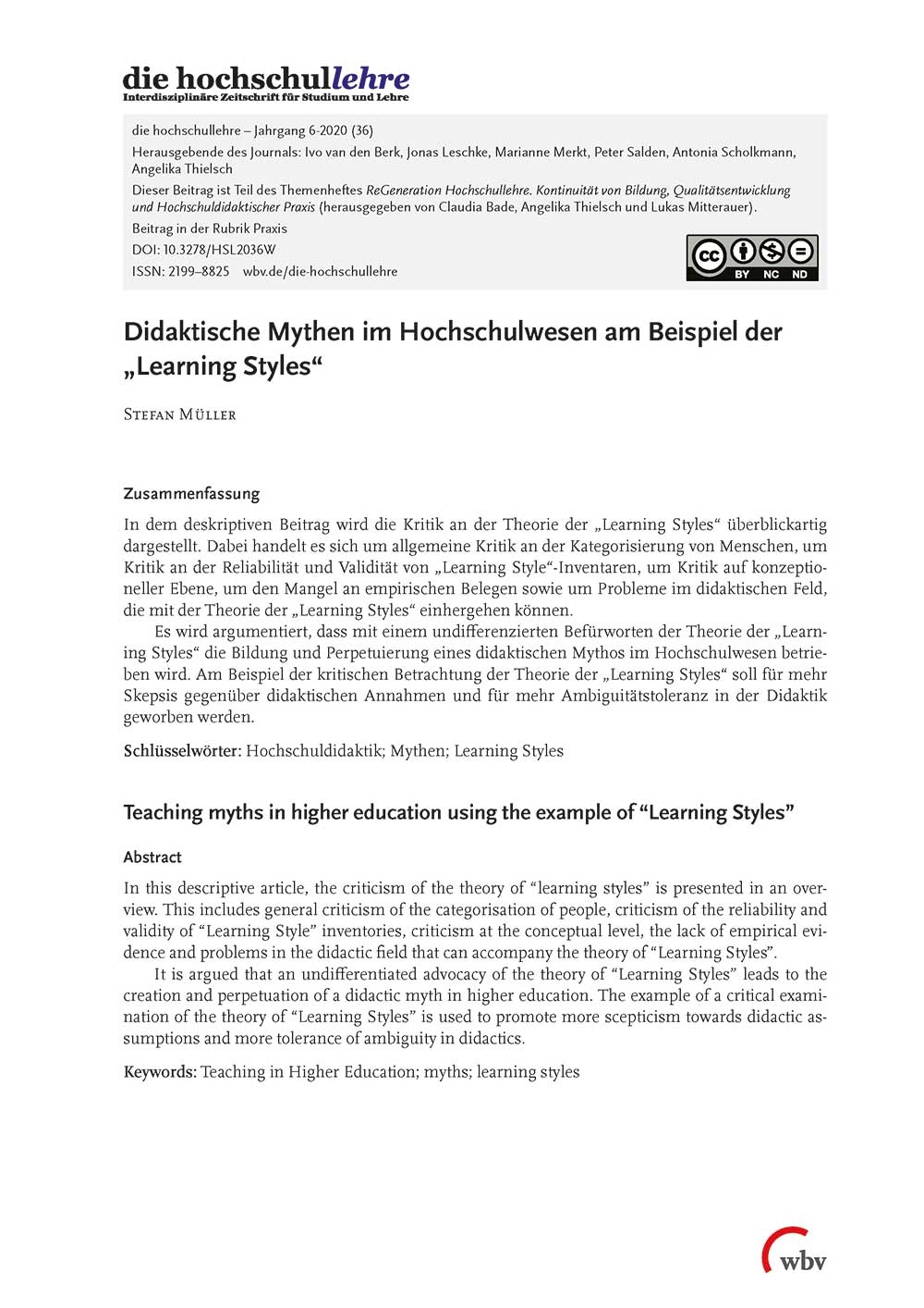 Müller, S. (2020). Didaktische Mythen im Hochschulwesen am Beispiel der „Learning Styles". die hochschullehre, Jahrgang 6/2020. DOI: 10.3278/HSL2036W