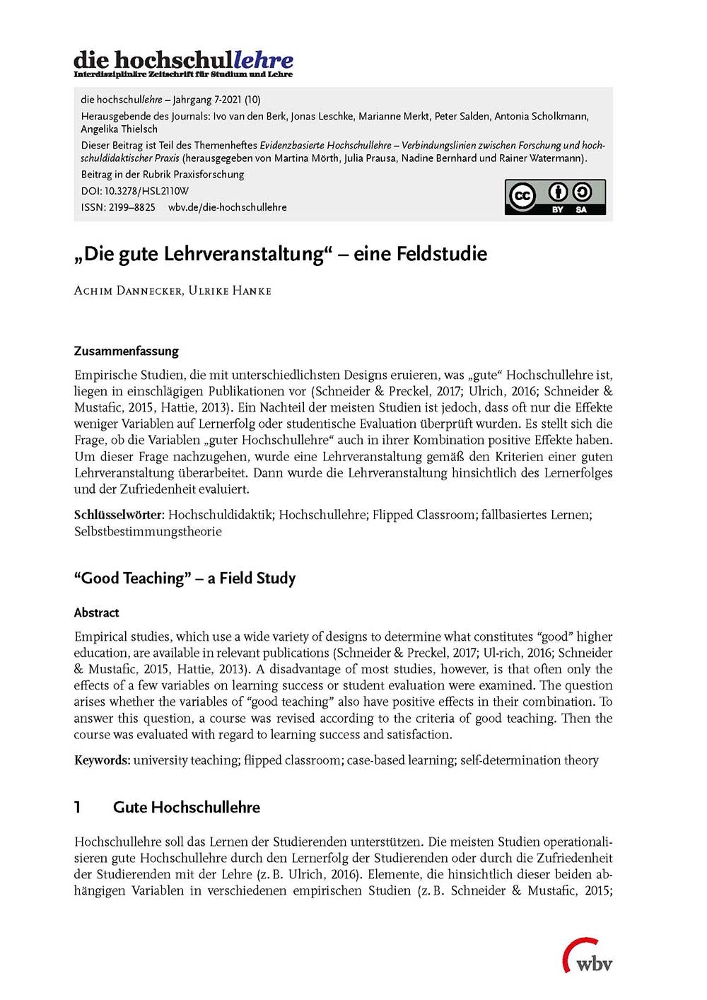 Dannecker, A., Hanke, U. (2021). "Die gute Lehrveranstaltung" - eine Feldstudie. die hochschullehre, Jahrgang 7/2021. Bielefeld: wbv. DOI: 10.3278/HSL2110W