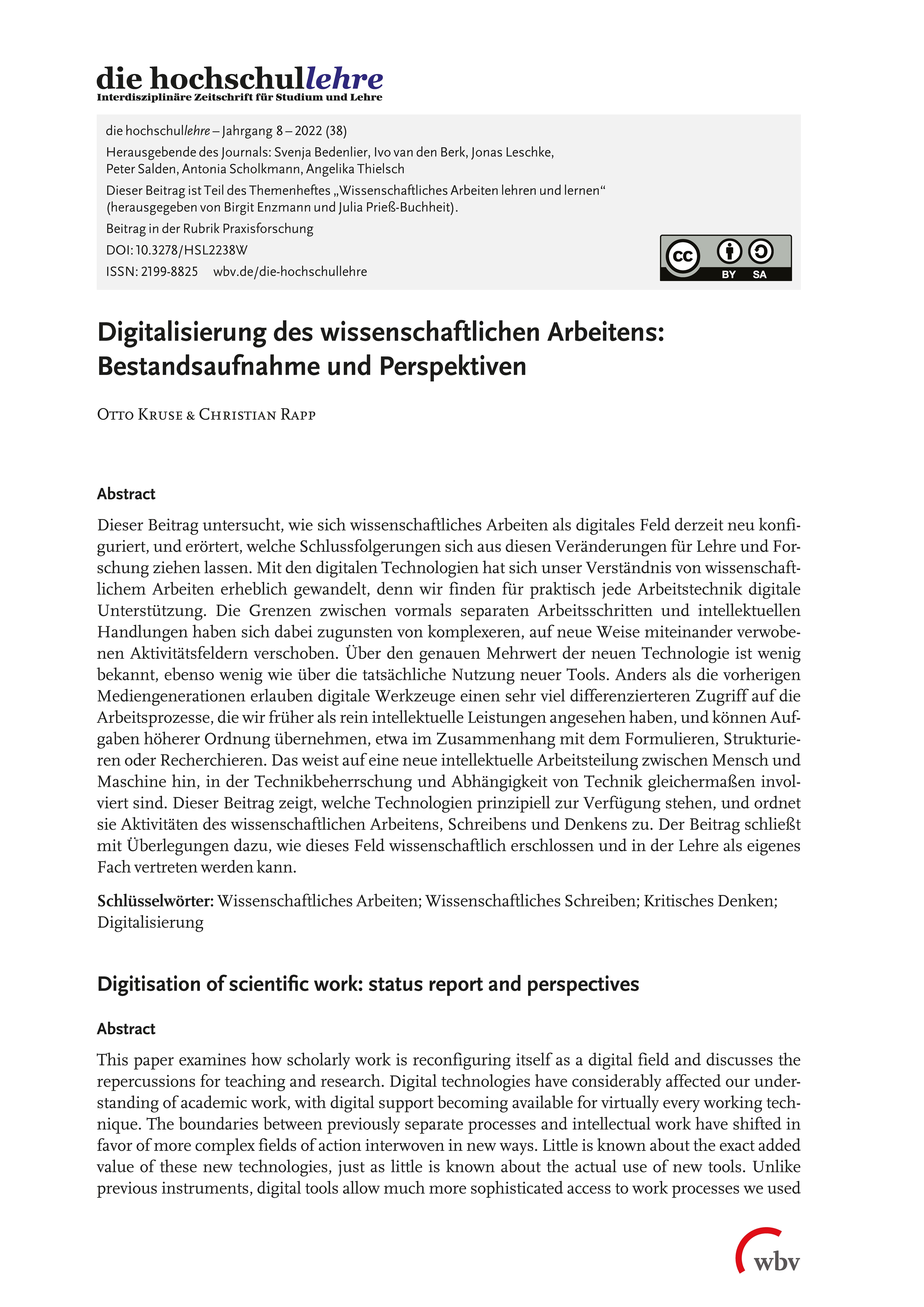 Kruse, O. & Rapp, C. (2022). Digitalisierung des wissenschaftlichen Arbeitens: Bestandsaufnahme und Perspektiven. die hochschullehre, Jahrgang 8/2022. DOI: 10.3278/HSL22238W.