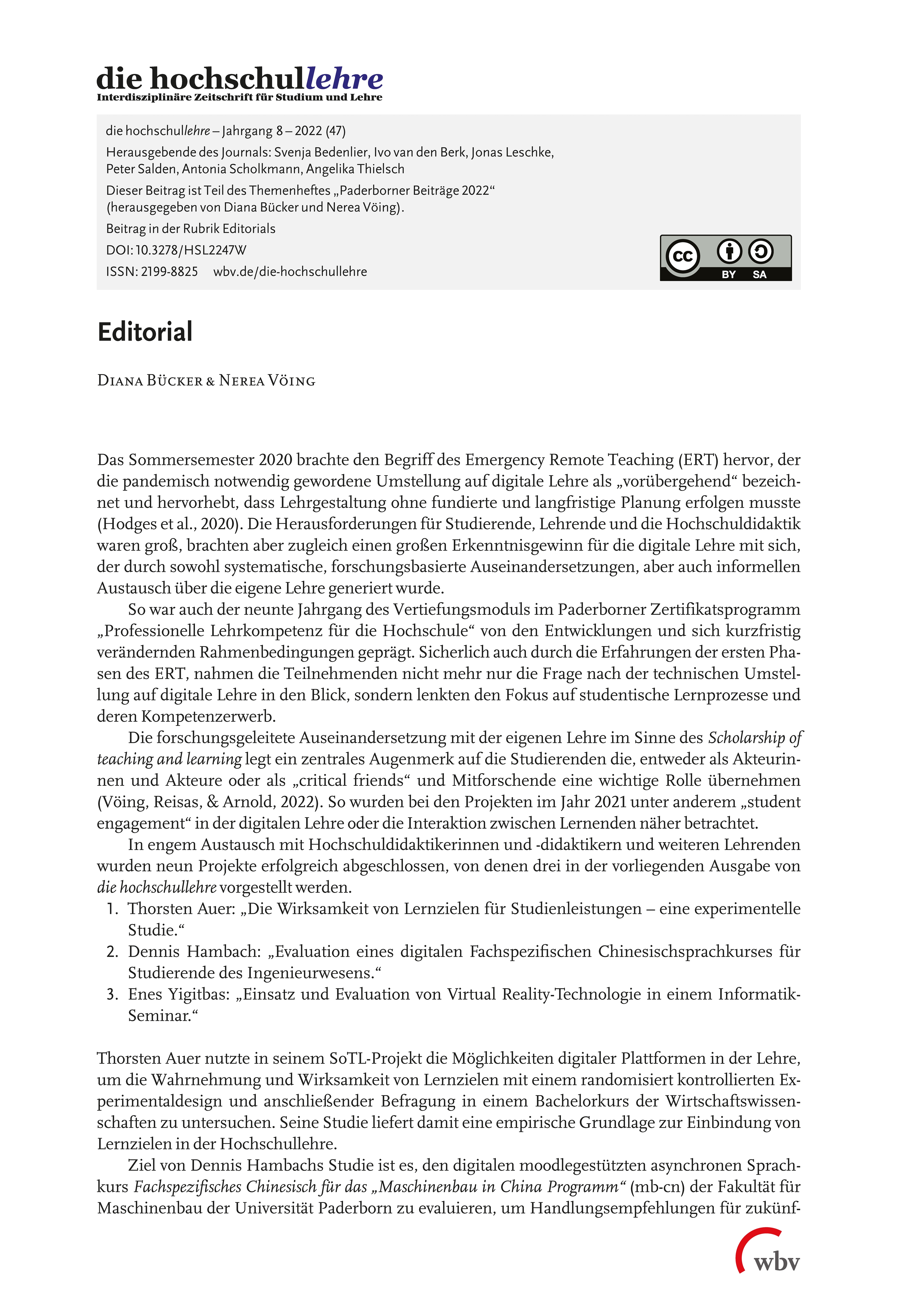 Bücker, Diana & Vöing, Nerea (2022). Editorial. die hochschullehre, Jahrgang 8/2022. DOI: 10.3278/HSL2247W