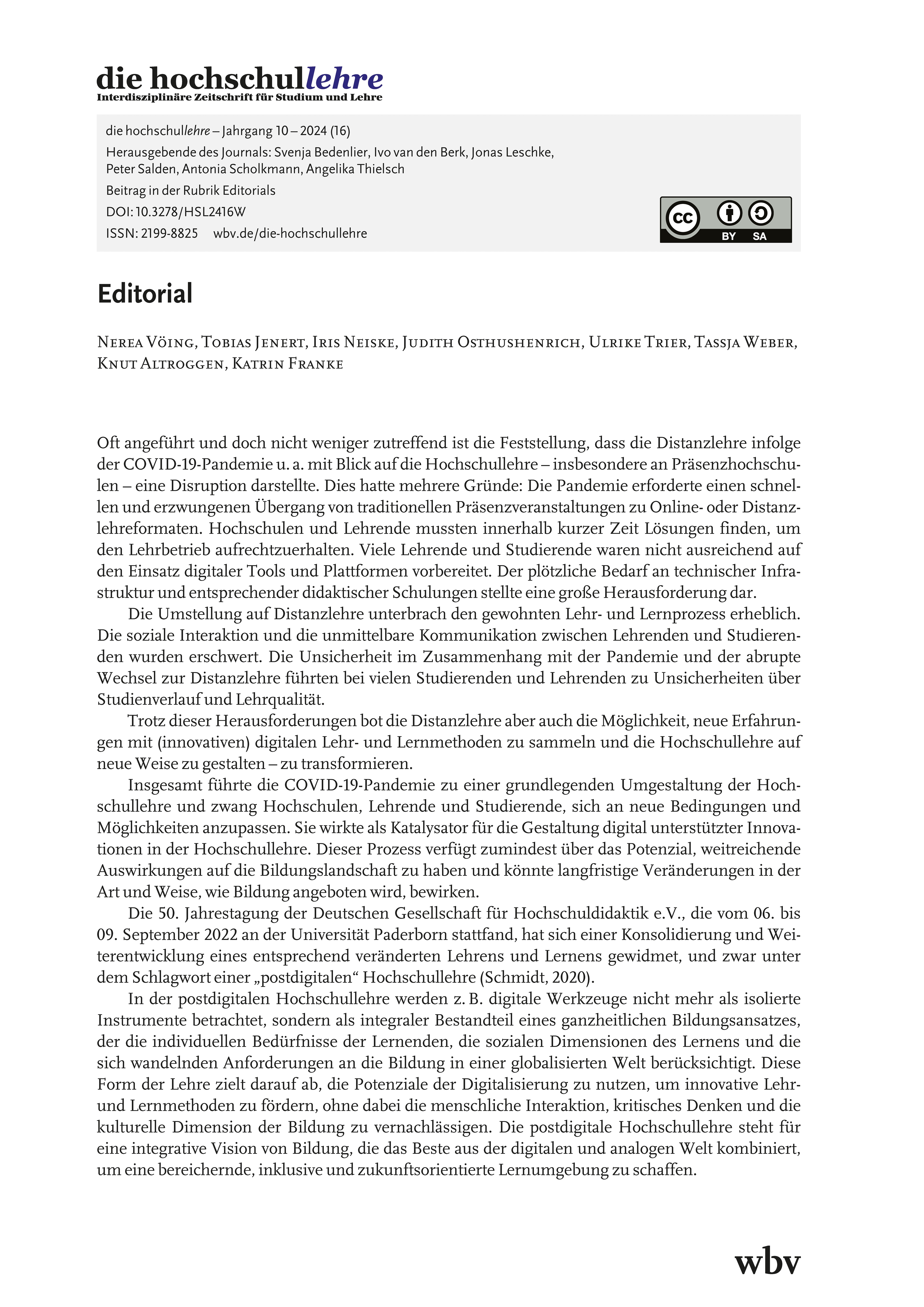 Vöing, N., Jenert, T., Neiske, I., Osthushenrich, J., Trier, U., Weber, T., Altroggen, K. & Franke, K. (2024): Editorial. die hochschullehre, Jahrgang 10/2024. DOI: 10.3278/HSL2416W.