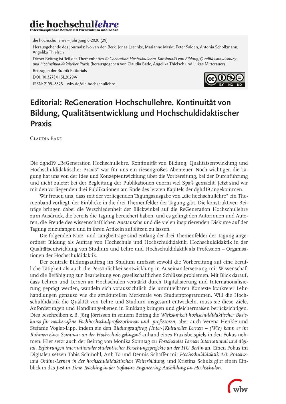 Bade, C. (2020). Editorial: ReGeneration Hochschullehre. Kontinuität von Bildung, Qualitätsentwicklung und Hochschuldidaktischer Praxis. die hochschullehre, Jahrgang 6/2020, online unter: www.hochschullehre.org DOI: 10.3278/HSL2029W.