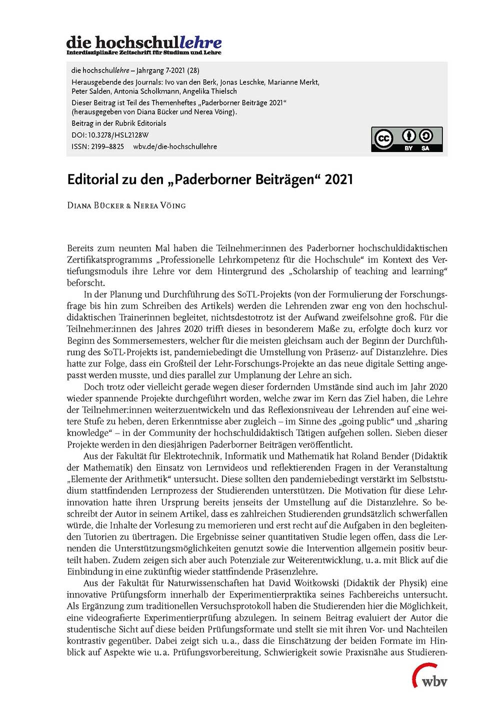 Bücker, D. & Vöing, N. (2021). Editorial zu den „Paderborner Beiträgen" 2021. die hochschullehre, Jahrgang 7/2021. Bielefeld: wbv. DOI: 10.3278/HSL2128W.