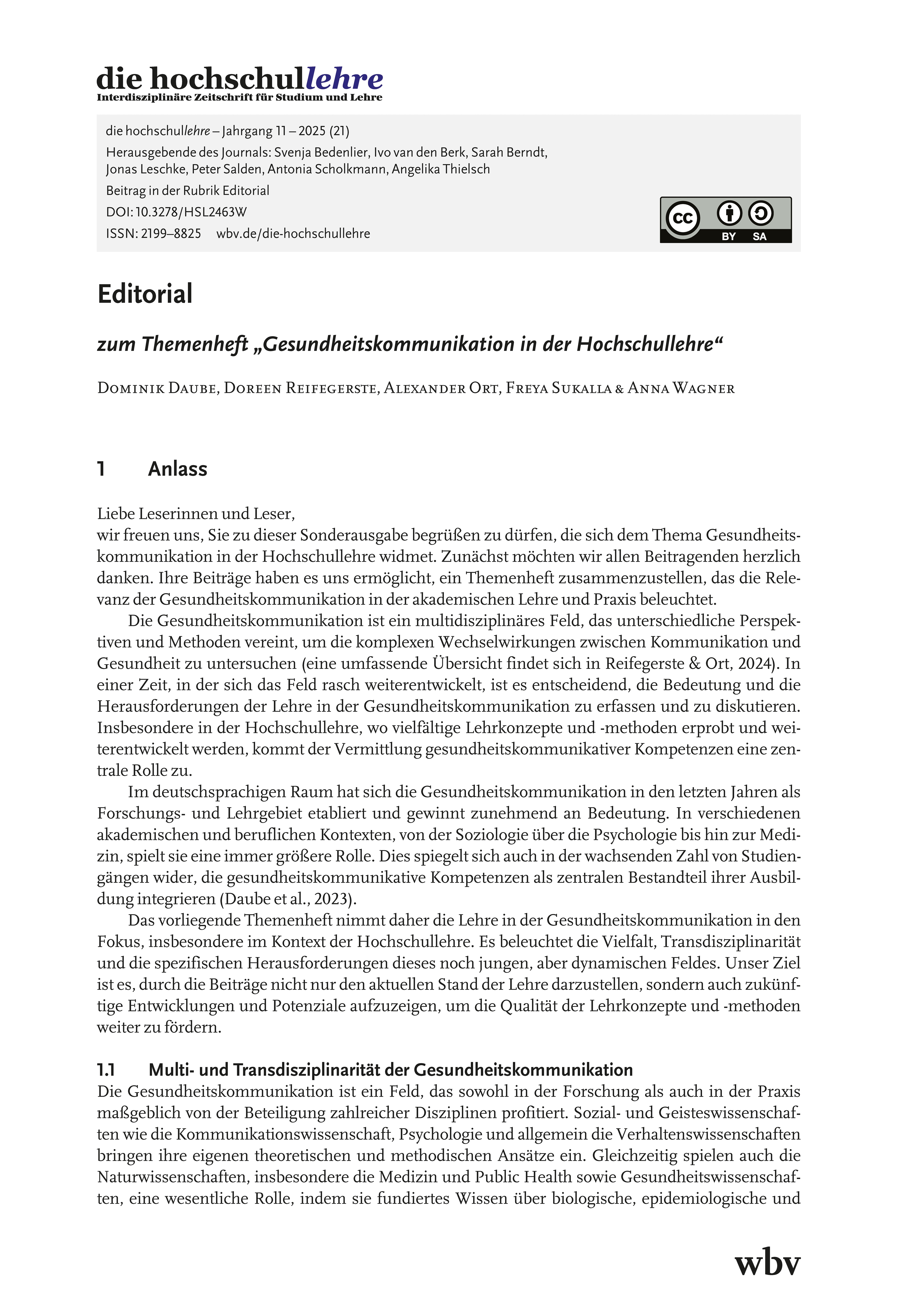 Daube, D., Reifegerste, D., Ort, A., Sukalla, F. & Wagner, A. (2025). Editorial zum Themenheft „Gesundheitskommunikation in der Hochschullehre". die hochschullehre, Jahrgang 11/2025. DOI: 10.3278/HSL2463W.
