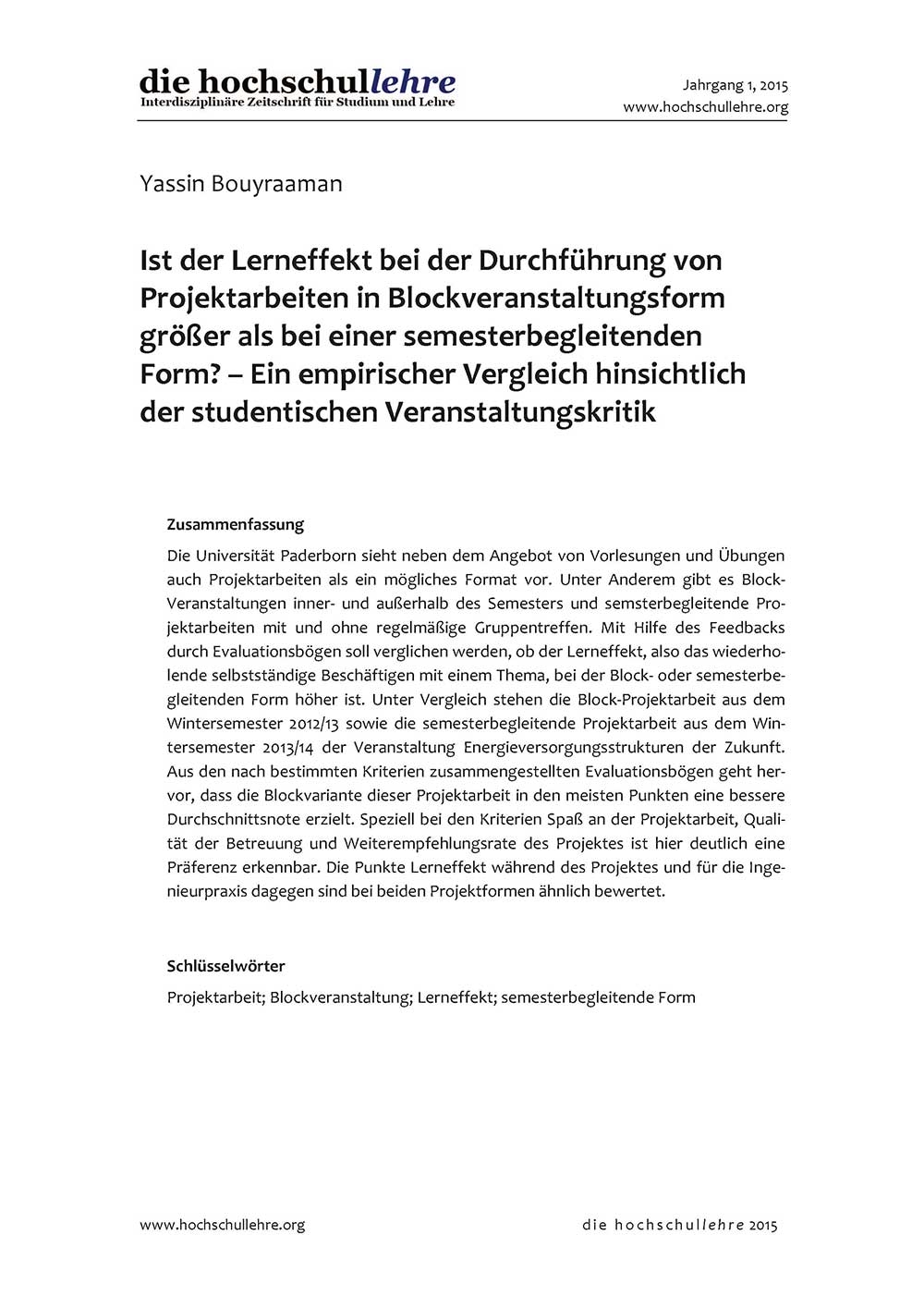 Die Universität Paderborn sieht neben dem Angebot von Vorlesungen und Übungen auch Projektarbeiten als ein mögliches Format vor. Unter Anderem gibt es Block-Veranstaltungen inner- und außerhalb des Semesters und semsterbegleitende Projektarbeiten mit und ohne regelmäßige Gruppentreffen. Mit Hilfe des Feedbacks durch Evaluationsbögen soll verglichen werden, ob der Lerneffekt, also das wiederholende selbstständige Beschäftigen mit einem Thema, bei der Block- oder semesterbegleitenden Form höher ist. Unter Vergleich stehen die Block-Projektarbeit aus dem Wintersemester 2012/13 sowie die semesterbegleitende Projektarbeit aus dem Wintersemester 2013/14 der Veranstaltung Energieversorgungsstrukturen der Zukunft. Aus den nach bestimmten Kriterien zusammengestellten Evaluationsbögen geht hervor, dass die Blockvariante dieser Projektarbeit in den meisten Punkten eine bessere Durchschnittsnote erzielt. Speziell bei den Kriterien Spaß an der Projektarbeit, Qualität der Betreuung und Weiterempfehlungsrate des Projektes ist hier deutlich eine Präferenz erkennbar. Die Punkte Lerneffekt während des Projektes und für die Ingenieurpraxis dagegen sind bei beiden Projektformen ähnlich bewertet.