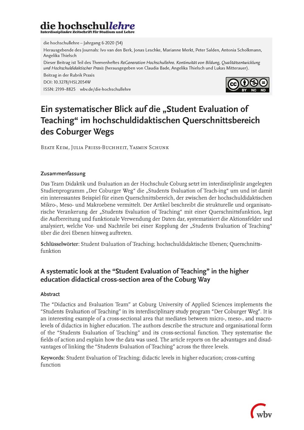 Keim, B., Prieß-Buchheit, J. & Schunk, Y. (2020). Ein systematischer Blick auf die „Student Evaluation of Teaching" im hochschuldidaktischen Querschnittsbereich des Coburger Wegs. die hochschullehre, Jahrgang 6/2020. DOI: 10.3278/HSL2054W