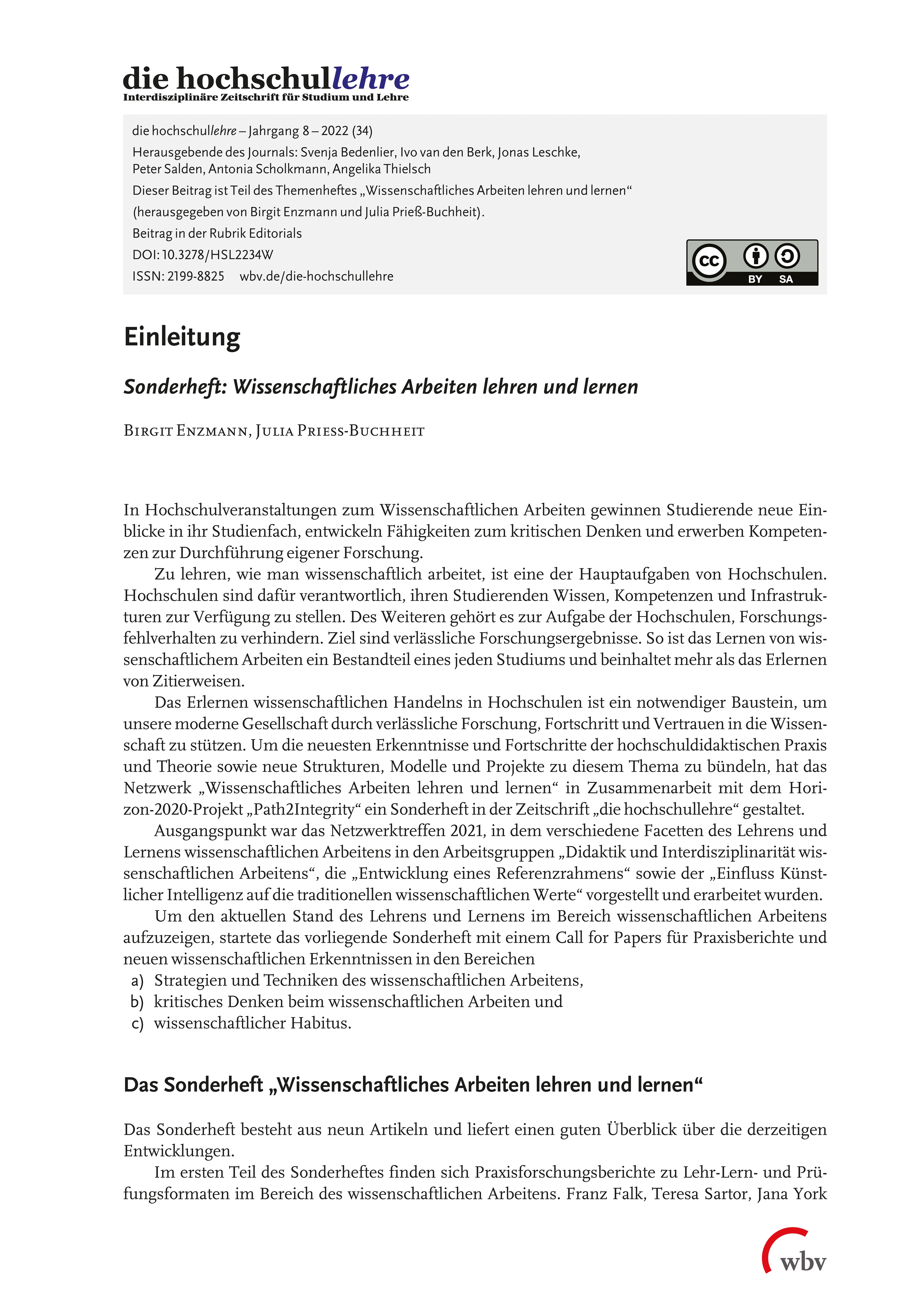Enzmann, B. & Prieß-Buchheit, J. (2022). Einleitung: Sonderheft wissenschaftliches Arbeiten lehren und lernen. die hochschullehre, Jahrgang 8/2022. DOI: 10.3278/HSL2234W