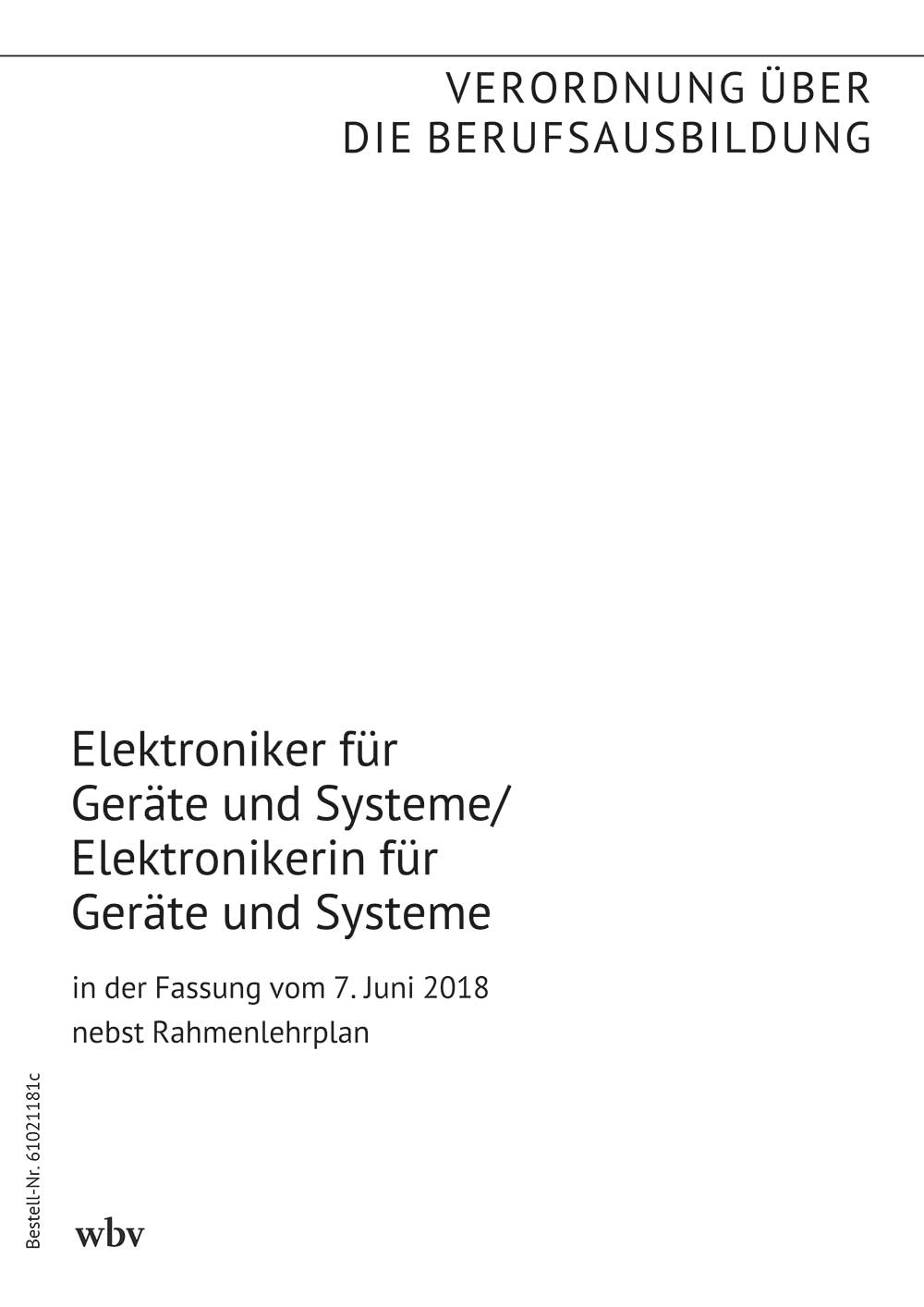 Verordnung über die Berufsausbildung in den industriellen Elektroberufen - Elektroniker für Geräte und Systeme/Elek tro nikerin für Geräte und Systeme vom 24. Juli 2007 (BGBl. I S. 1678 vom 30. Juli 2007), zuletzt geändert durch die Verordnung vom 7. Juni 2018 (BGBl. I S. 678 vom 13. Juni 2018) nebst Rahmenlehrplan (Beschluss der Kultusministerkonferenz vom 16. Mai 2003 in der Fassung vom 23. Februar 2018)