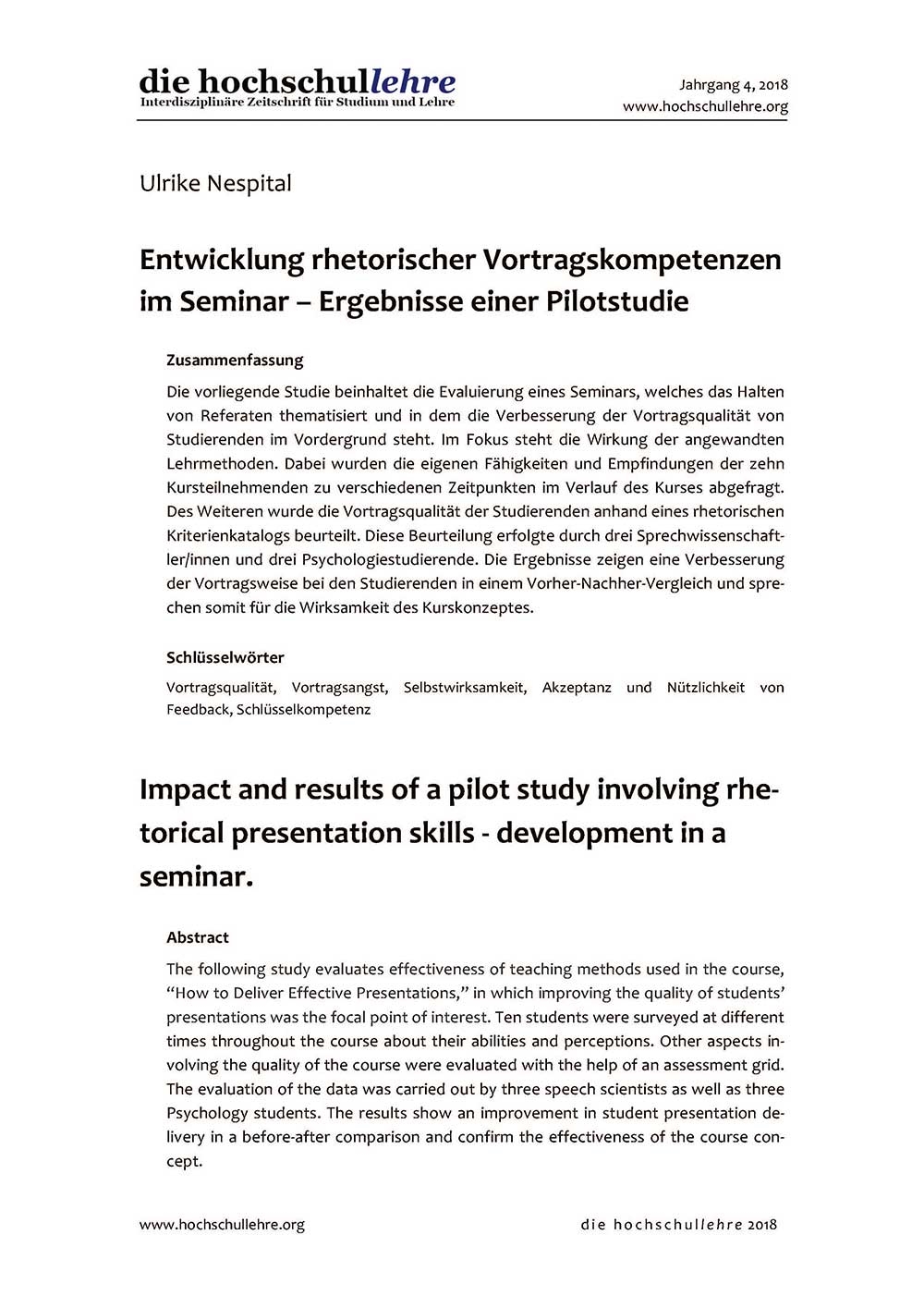 Die vorliegende Studie beinhaltet die Evaluierung eines Seminars, welches das Halten von Referaten thematisiert und in dem die Verbesserung der Vortragsqualität von Studierenden im Vordergrund steht. Im Fokus steht die Wirkung der angewandten Lehrmethoden. Dabei wurden die eigenen Fähigkeiten und Empfindungen der zehn Kursteilnehmenden zu verschiedenen Zeitpunkten im Verlauf des Kurses abgefragt. Des Weiteren wurde die Vortragsqualität der Studierenden anhand eines rhetorischen Kriterienkatalogs beurteilt. Diese Beurteilung erfolgte durch drei Sprechwissenschaftler/innen und drei Psychologiestudierende. Die Ergebnisse zeigen eine Verbesserung der Vortragsweise bei den Studierenden in einem Vorher-Nachher-Vergleich und sprechen somit für die Wirksamkeit des Kurskonzeptes.