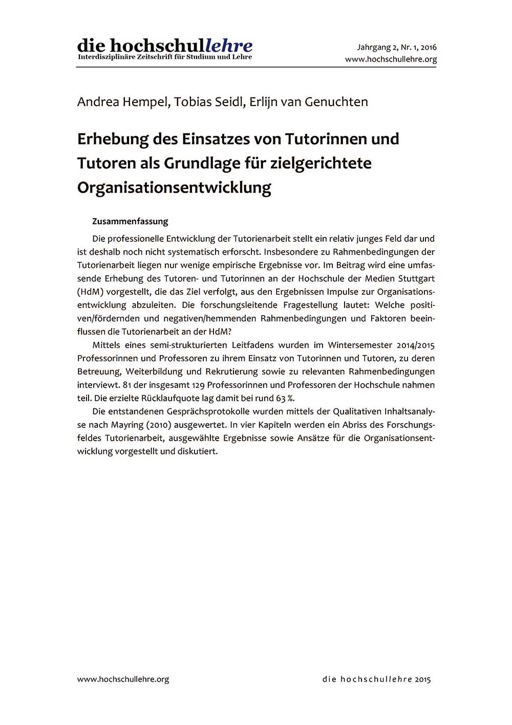 Die professionelle Entwicklung der Tutorienarbeit stellt ein relativ junges Feld dar und ist deshalb noch nicht systematisch erforscht. Insbesondere zu Rahmenbedingungen der Tutorienarbeit liegen nur wenige empirische Ergebnisse vor. Im Beitrag wird eine umfassende Erhebung des Einsatzes von Tutoren- und Tutorinnen an der Hochschule der Medien Stuttgart (HdM) vorgestellt, die das Ziel verfolgt, aus den Ergebnissen Impulse zur Organisationsentwicklung abzuleiten. Die forschungsleitende Fragestellung lautet: Welche positiven/fördernden und negativen/hemmenden Rahmenbedingungen und Faktoren beeinflussen die Tutorienarbeit an der HdM?