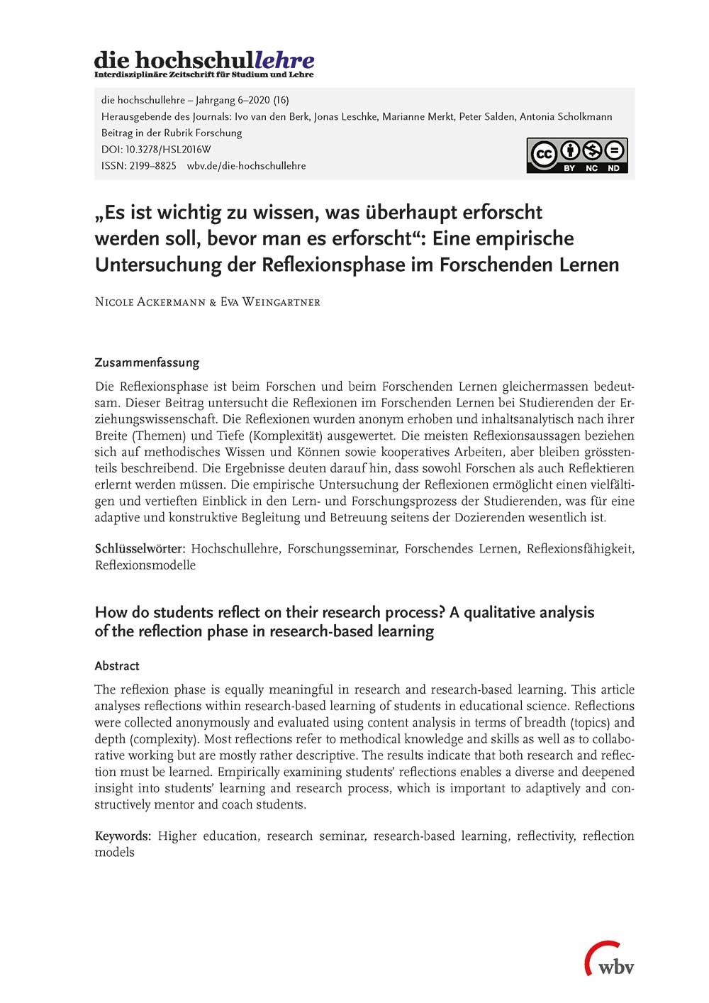 Ackermann, N., & Weingartner, E. (2020). „Es ist wichtig zu wissen, was überhaupt erforscht werden soll, bevor man es erforscht": Eine empirische Untersuchung der Reflexionsphase im Forschenden Lernen. die hochschullehre, Jahrgang 6/2020. DOI: 10.3278/HSL2016W.