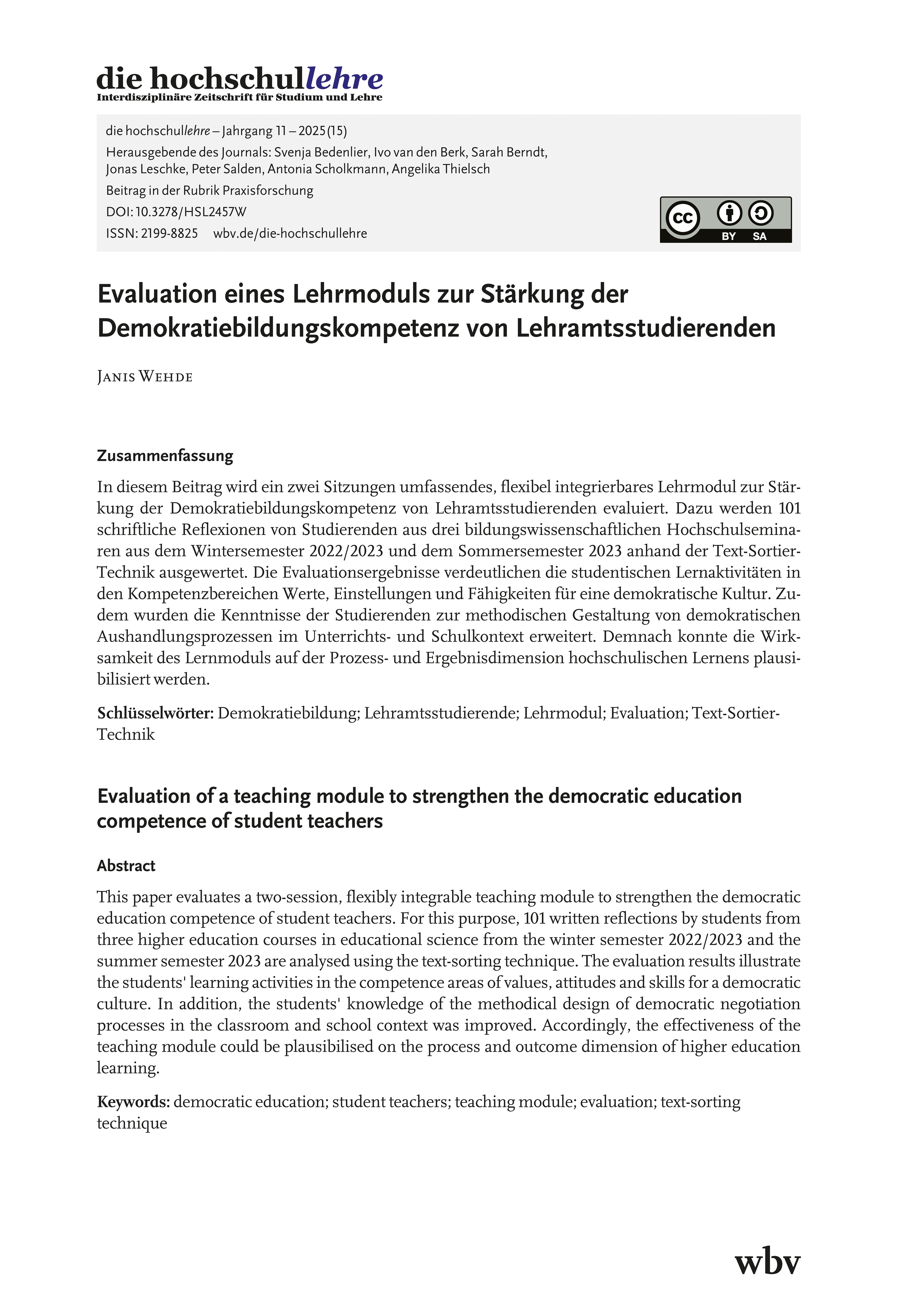Wehde, J. (2025). Evaluation eines Lehrmoduls zur Stärkung der Demokratiebildungskompetenz