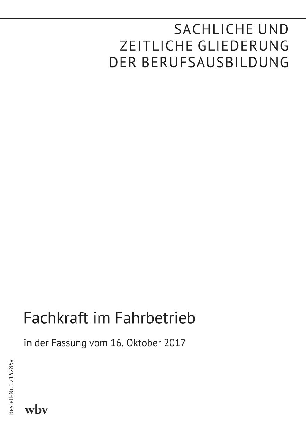 Die sachliche und zeitliche Gliederung der zu vermittelnden Kenntnisse und Fertigkeiten laut Ausbildungsrahmenplan der Ausbildungsverordnung in der Fassung vom 16. Oktober 2017.