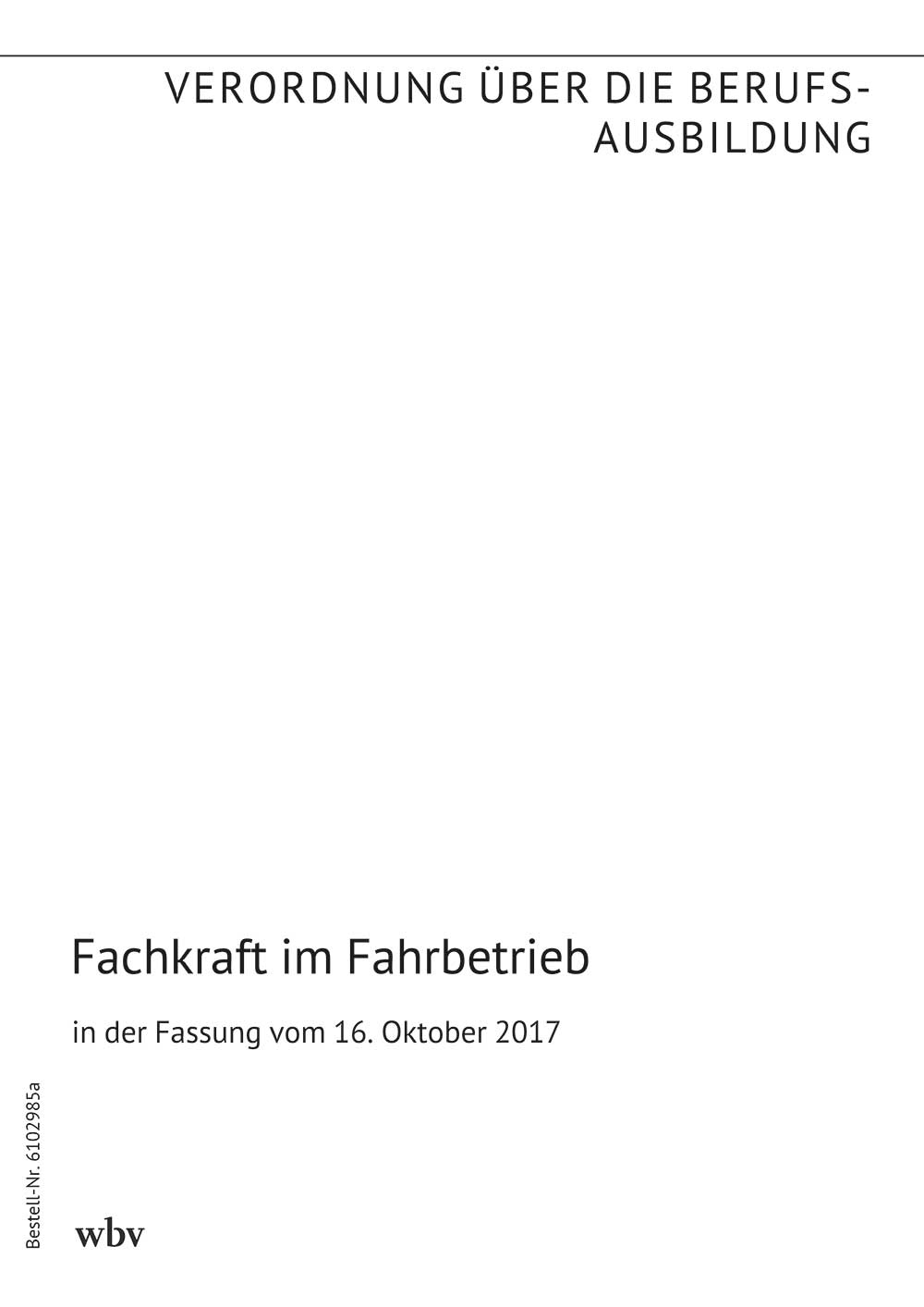 Verordnung über die Berufsausbildung zur Fachkraft im Fahrbetrieb vom 11. Juli 2002 (BGBl. I S. 2612 vom 17. Juli 2002), zuletzt geändert durch die Verordnung vom 16. Oktober 2017 (BGBl. I S. 3565 vom 23. Oktober 2017)