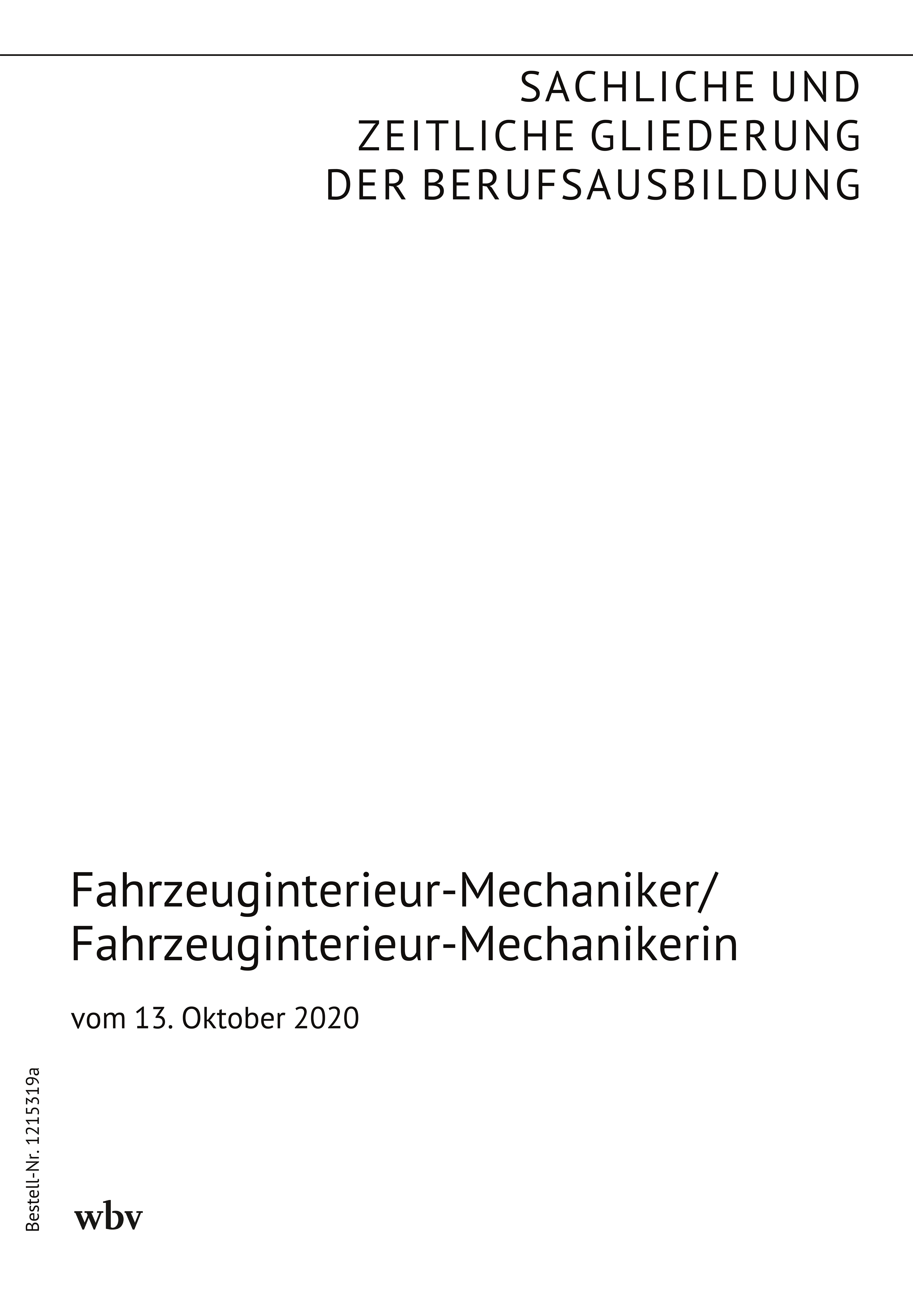 Die sachliche und zeitliche Gliederung der zu vermittelnden Kenntnisse und Fertigkeiten laut Ausbildungsrahmenplan der Ausbildungsverordnung vom 13. Oktober 2020.