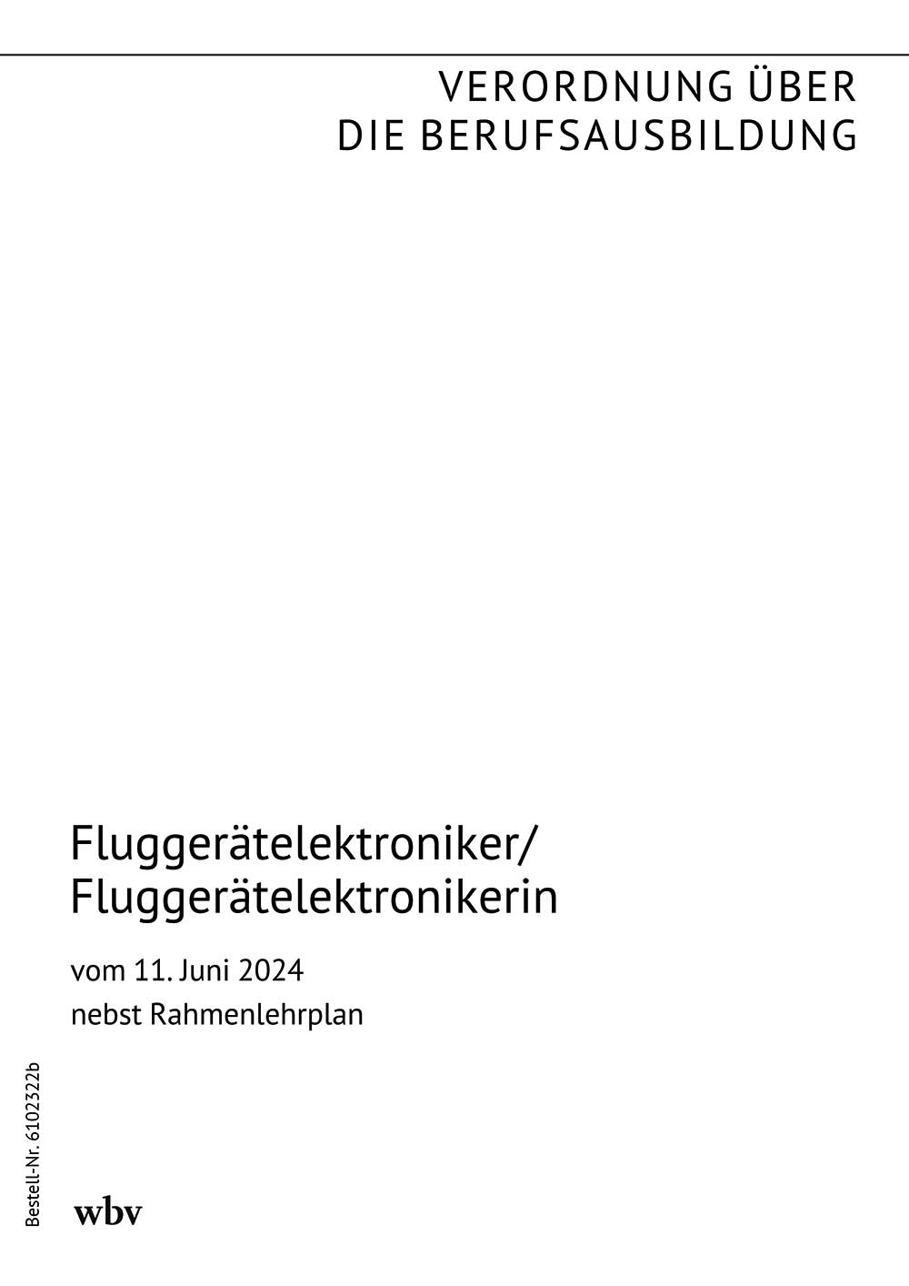 Verordnung über die Berufsausbildung zum Fluggerätelektroniker/zur Fluggerätelektronikerin vom 28. Juni 2013 (BGBl. I S. 2201 vom 12. Juli 2013), geändert durch die Verordnung vom 27. Januar 2014 (BGBI. I S. 90 vom 10. Februar 2014) zuletzt geändert durch die Verordnung vom 11. Juni 2024 (BGBl. I Nr. 186 vom 14. Juni 2024) nebst Rahmenlehrplan (Beschluss der Kultusministerkonferenz vom 25.04.2013 i. d. F. vom 22.03.2024)