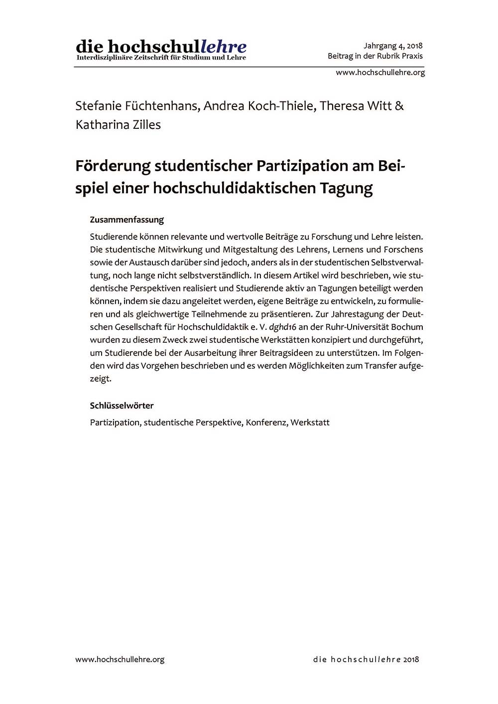 Studierende können relevante und wertvolle Beiträge zu Forschung und Lehre leisten. Die studentische Mitwirkung und Mitgestaltung des Lehrens, Lernens und Forschens sowie der Austausch darüber sind jedoch, anders als in der studentischen Selbstverwaltung, noch lange nicht selbstverständlich. In diesem Artikel wird beschrieben, wie studentische Perspektiven realisiert und Studierende aktiv an Tagungen beteiligt werden können, indem sie dazu angeleitet werden, eigene Beiträge zu entwickeln, zu formulieren und als gleichwertige Teilnehmende zu präsentieren. Zur Jahrestagung der Deutschen Gesellschaft für Hochschuldidaktik e. V. dghd16 an der Ruhr-Universität Bochum wurden zu diesem Zweck zwei studentische Werkstätten konzipiert und durchgeführt, um Studierende bei der Ausarbeitung ihrer Beitragsideen zu unterstützen. Im Folgenden wird das Vorgehen beschrieben und es werden Möglichkeiten zum Transfer aufgezeigt.