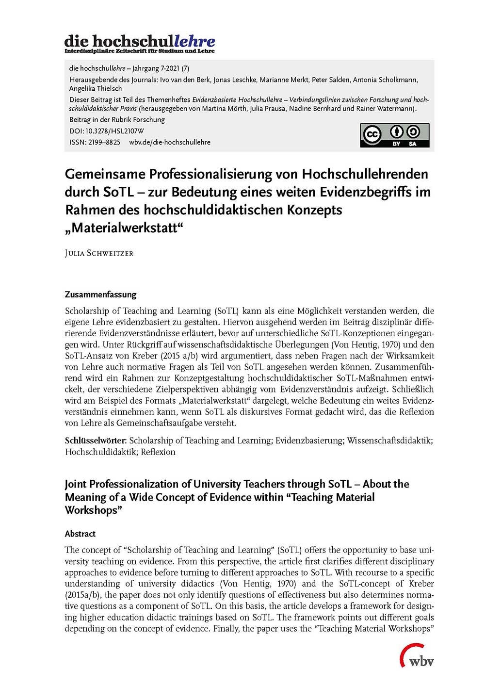 Schweitzer, J. (2021). Gemeinsame Professionalisierung von Hochschullehrenden durch SoTL - zur Bedeutung eines weiten Evidenzbegriffs im Rahmen des hochschuldidaktischen Konzepts "Materialwerkstatt". die hochschullehre, Jahrgang 7/2021. Bielefeld: wbv. DOI: 10.3278/HSL2107W.