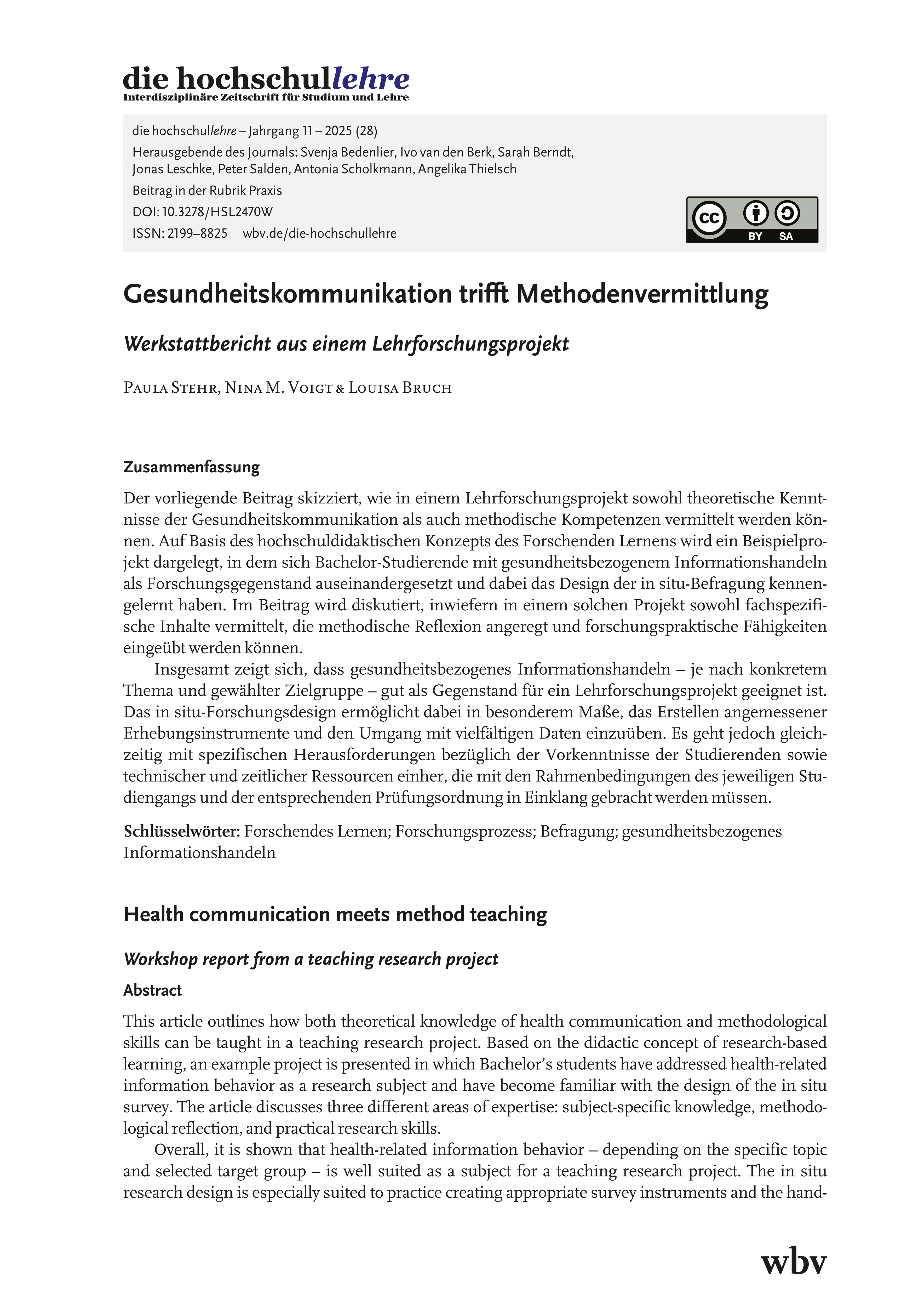Stehr, P., Voigt, N. & Bruch, L. (2025). Gesundheitskommunikation trifft Methodenvermittlung. Werkstattbericht aus einem Lehrforschungsprojekt. die hochschullehre, Jahrgang 11/2025. DOI: 10.3278/HSL2470W.