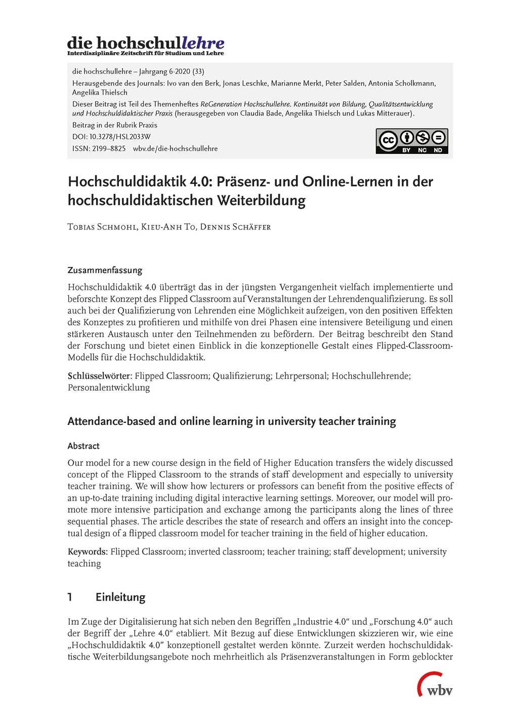 Schmohl, T., To, K.-A. & Schäffer, D. (2020). Hochschuldidaktik 4.0: Präsenz- und Online-Lernen in der hochschuldidaktischen Weiterbildung. die hochschullehre, Jahrgang 6/2020. DOI: 10.3278/HSL2033W