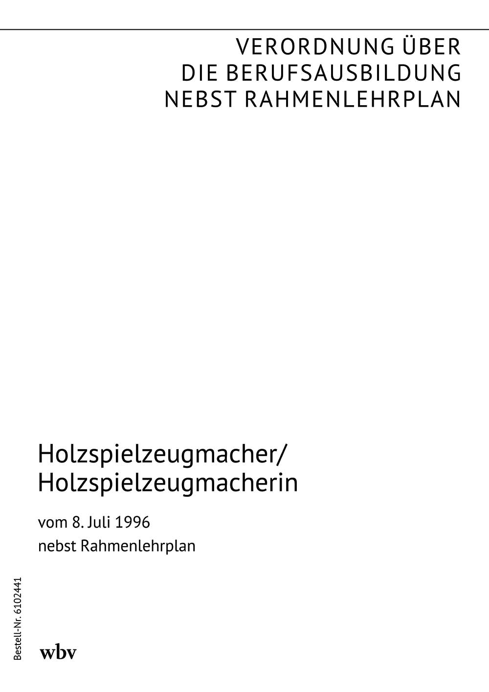 Verordnung über die Berufsausbildung zum Holzspielzeugmacher/zur Holzspielzeugmacherin vom 8. Juli 1996 (BGBl. I S. 940 vom 12. Juli 1996), nebst Rahmenlehrplan für den Ausbildungsberuf Holzspielzeugmacher/Holzspielzeugmacherin (Beschluß der Kultusministerkonferenz vom 9. Mai 1996, Beilage zum Bundesanzeiger Nr. 194 vom 16. Oktober 1996)