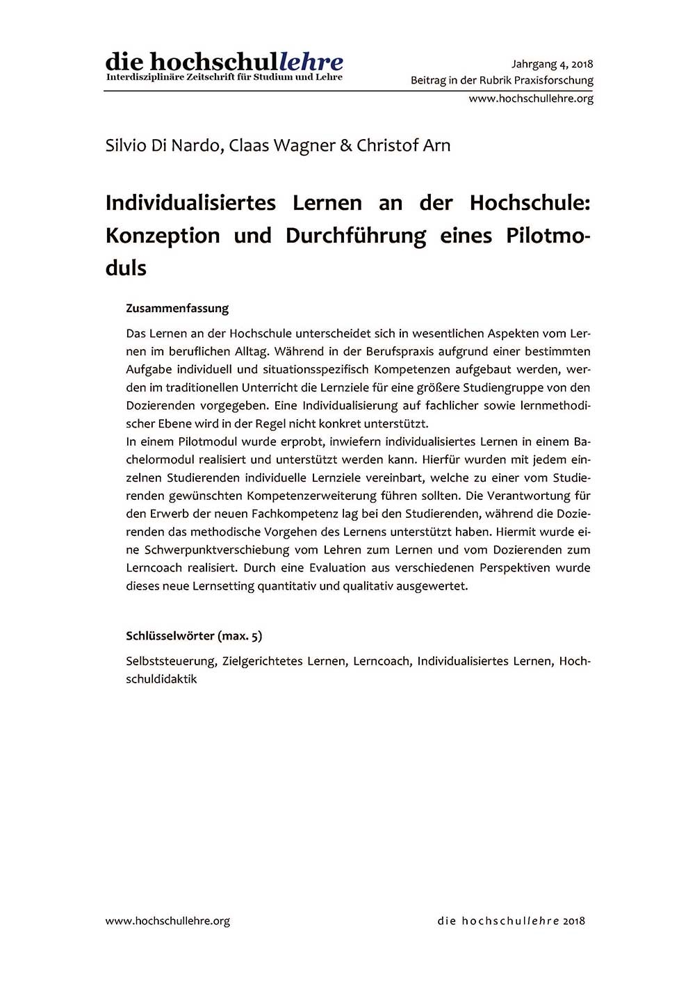 In einem Pilotmodul wurde erprobt, inwiefern individualisiertes Lernen in einem Bachelormodul realisiert und unterstützt werden kann. Hierfür wurden mit jedem einzelnen Studierenden individuelle Lernziele vereinbart, welche zu einer vom Studierenden gewünschten Kompetenzerweiterung führen sollten. Die Verantwortung für den Erwerb der neuen Fachkompetenz lag bei den Studierenden, während die Dozierenden das methodische Vorgehen des Lernens unterstützt haben. Hiermit wurde eine Schwerpunktverschiebung vom Lehren zum Lernen und vom Dozierenden zum Lerncoach realisiert. Durch eine Evaluation aus verschiedenen Perspektiven wurde dieses neue Lernsetting quantitativ und qualitativ ausgewertet.