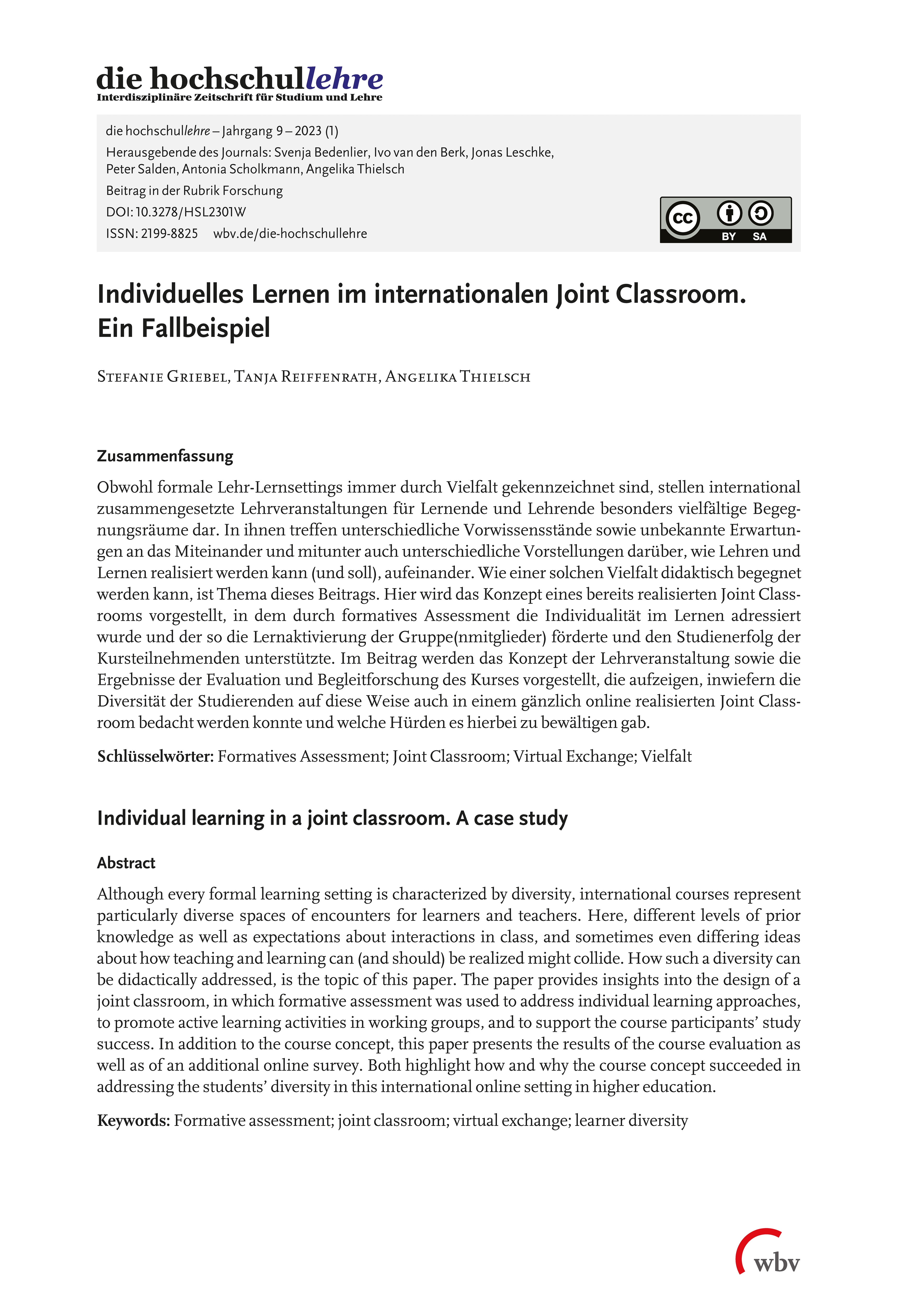 Griebel, S., Reiffenrath, T. & Thielsch, A. (2023). Individuelles Lernen im internationalen Joint Classroom. Ein Fallbeispiel. die hochschullehre, Jahrgang 9/2023. DOI: 10.3278/HSL2302W.