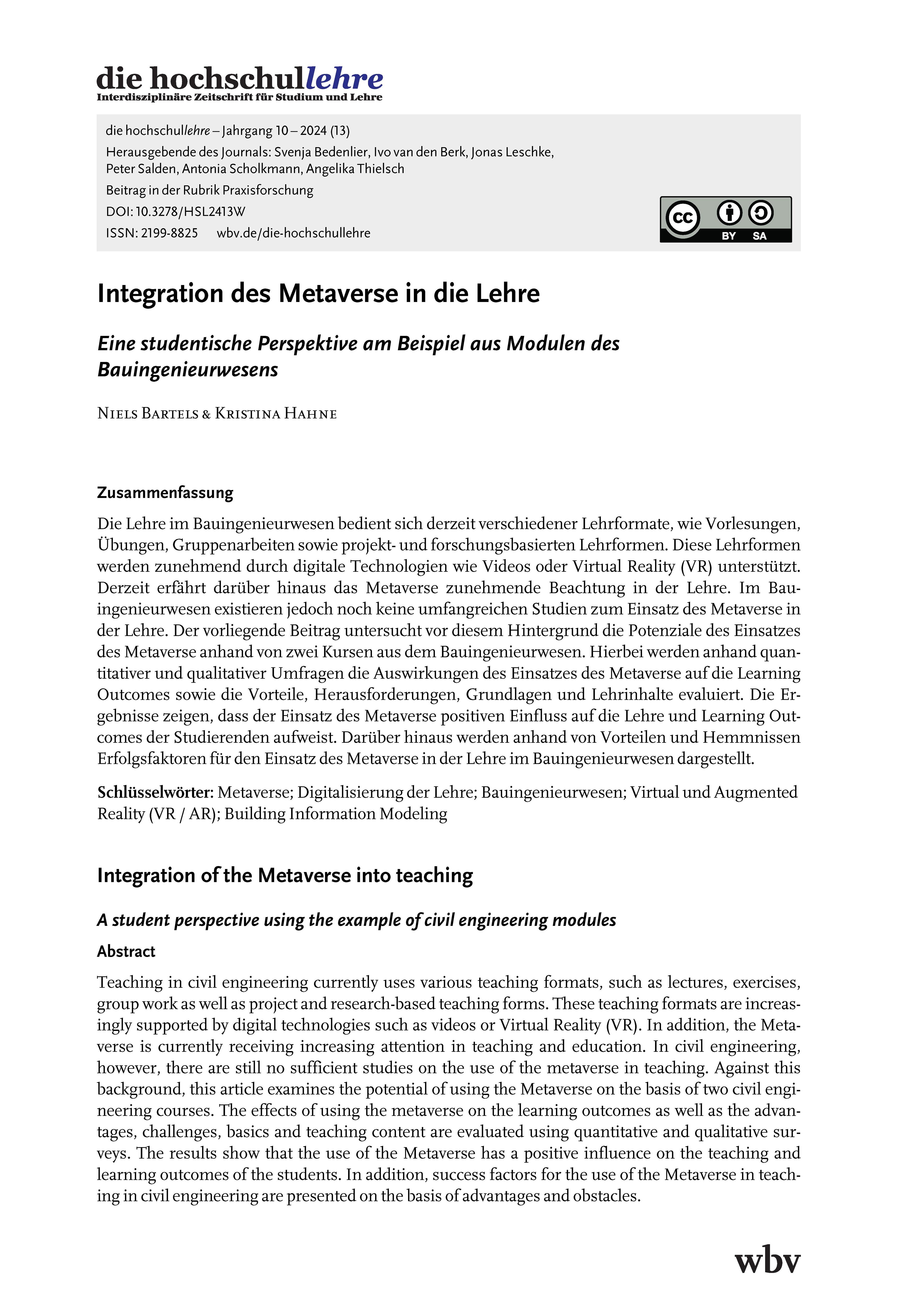 Bartels, N. & Hahne, K. (2024). Integration des Metaverse in die Lehre. Eine studentische Perspektive am Beispiel aus Modulen des Bauingenieurwesens. die hochschullehre, Jahrgang 10/2024. DOI: 10.3278/HSL2413W