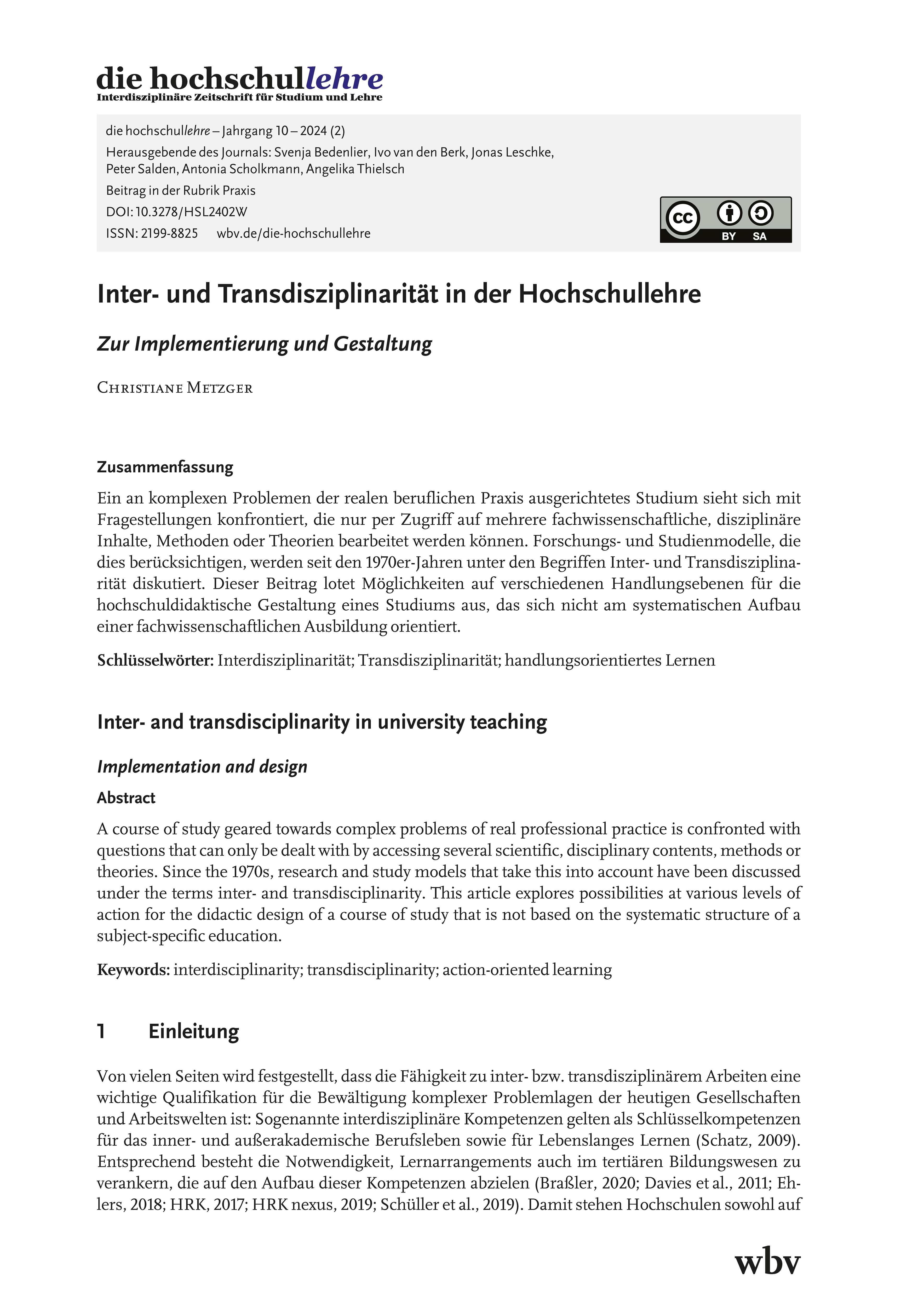Metzger, C. (2024). Inter- und Transdisziplinarität in der Hochschullehre. Zur Implementierung und Gestaltung. die hochschullehre, Jahrgang 10/2024. DOI: 10.3278/HSL2402W.