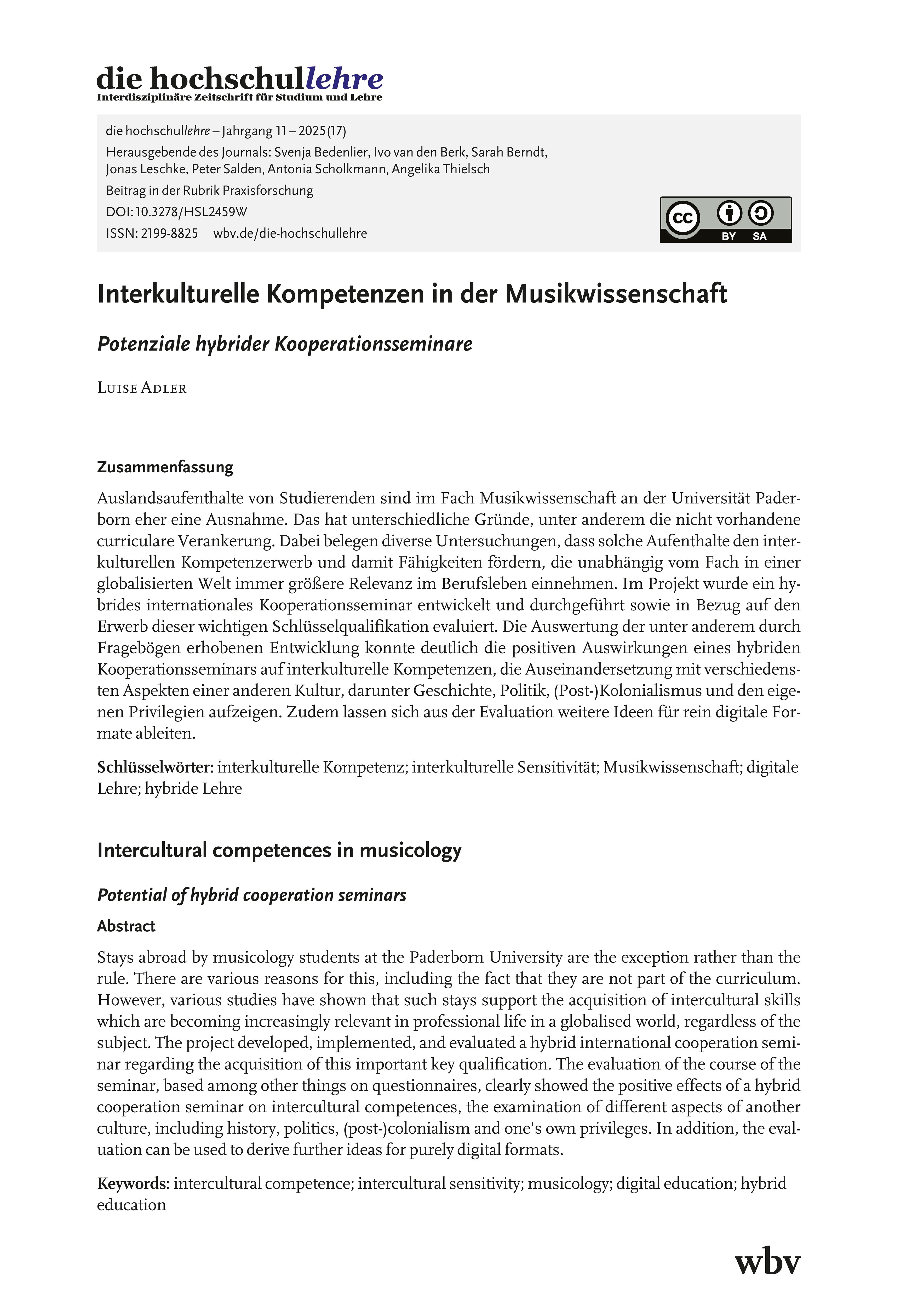 Adler, L. (2025). Interkulturelle Kompetenzen in der Musikwissenschaft. Potenziale hybrider Kooperationsseminare. die hochschullehre, Jahrgang 11/2025. DOI: 10.3278/HSL2459W.