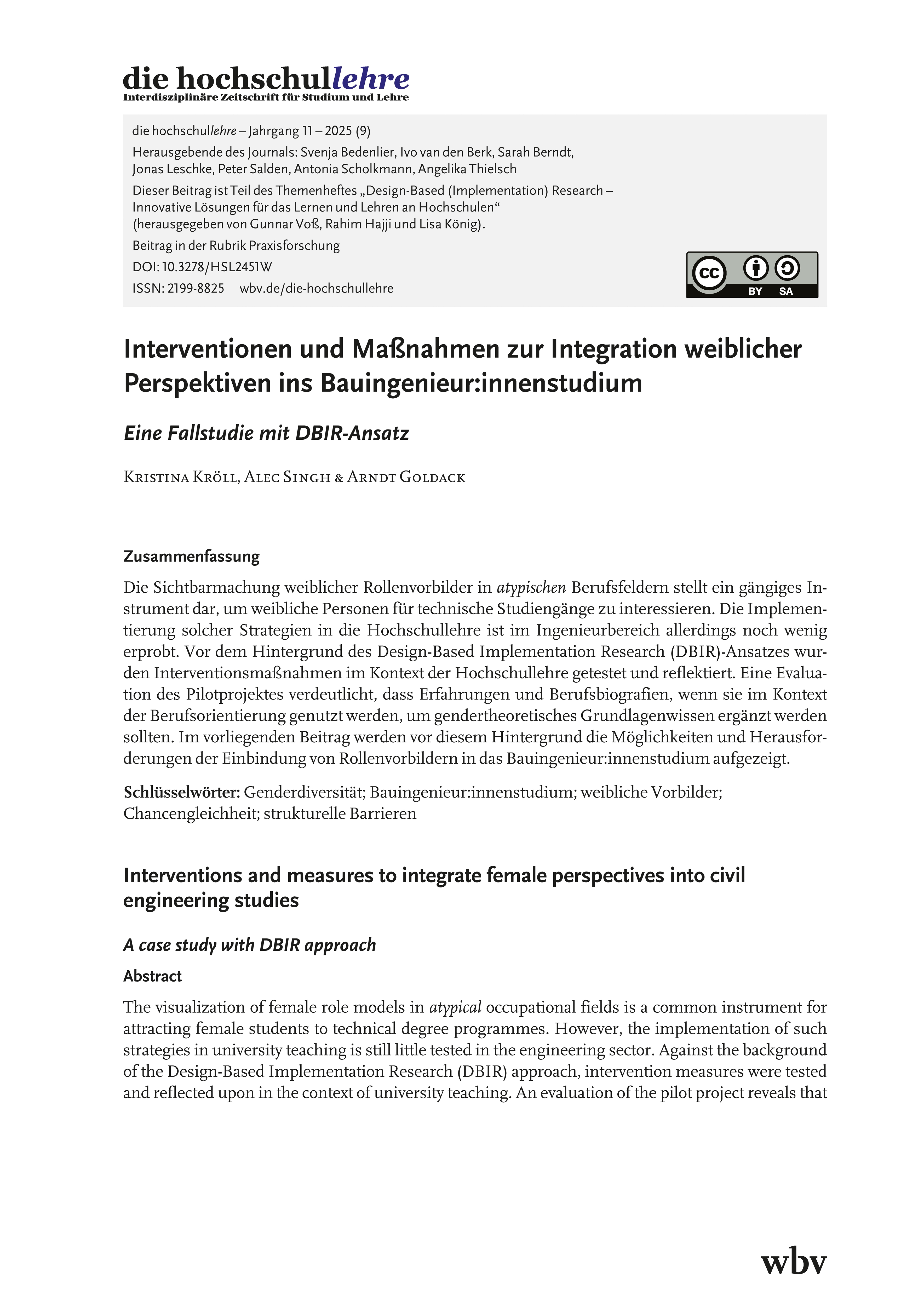 Kröll, K., Singh, A. & Goldack, A. (2025). Interventionen und Maßnahmen zur Integration weiblicher Perspektiven ins Bauingenieur:innenstudium. die hochschullehre, Jahrgang 11/2025. DOI: 10.3278/HSL2451W.