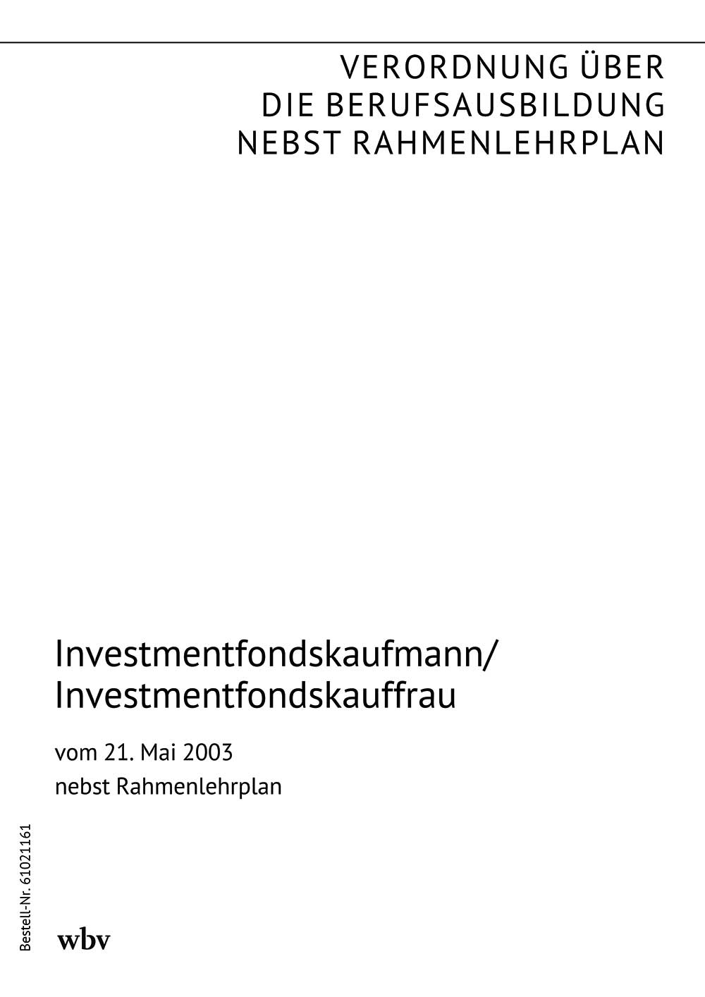 Verordnung über die Berufsausbildung zum Investmentfondskaufmann/zur Investmentfondskauffrau vom 21. Mai 2003 (BGBl. I S. 718 vom 30. Mai 2003) nebst Rahmenlehrplan für den Ausbildungsberuf Investmentfondskaufmann/Investmentfondskauffrau (Beschluss der Kultusministerkonferenz vom 21. März 2003)