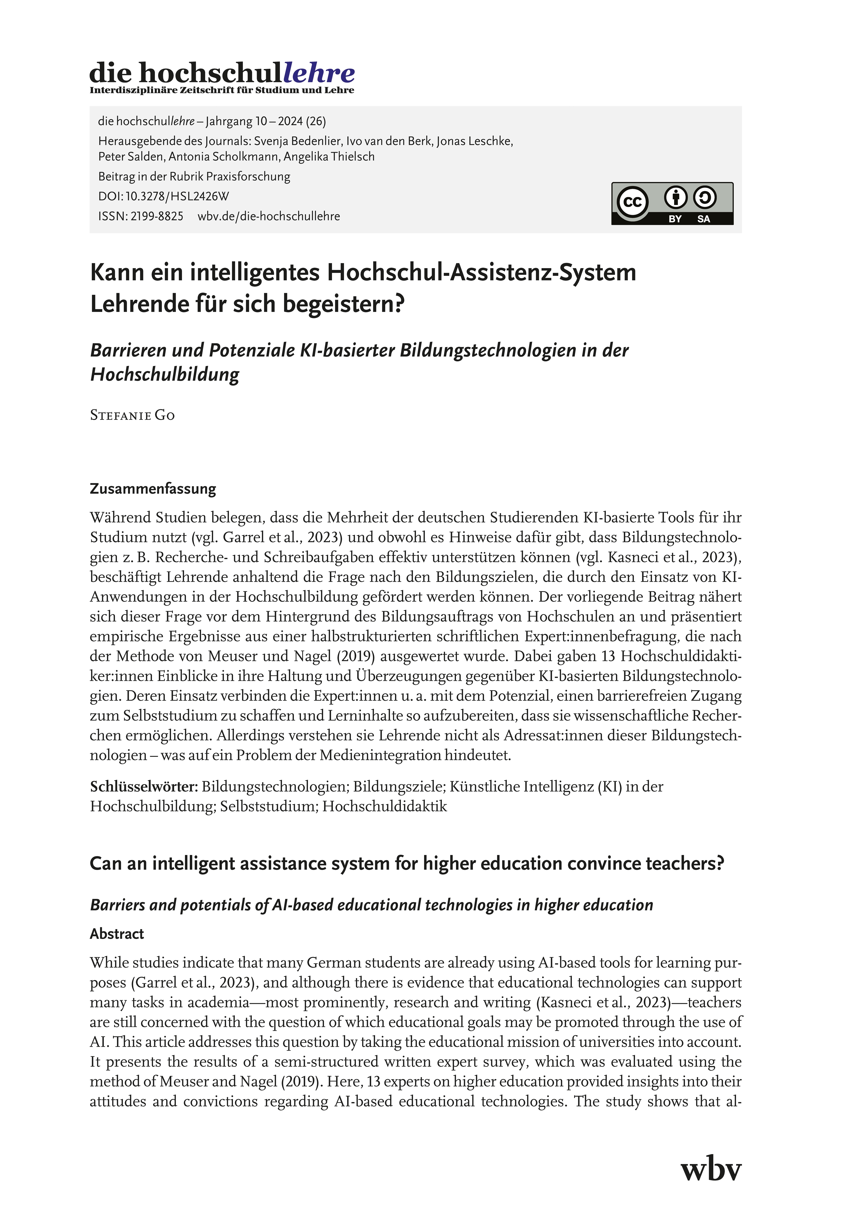 Go, S. (2024). Kann Künstliche Intelligenz Lehrende für sich begeistern? Barrieren und Potenziale von KI-basierten Bildungstechnologien in der Hochschulbildung. die hochschullehre, Jahrgang 10/2024. DOI: 10.3278/HSL2426W.