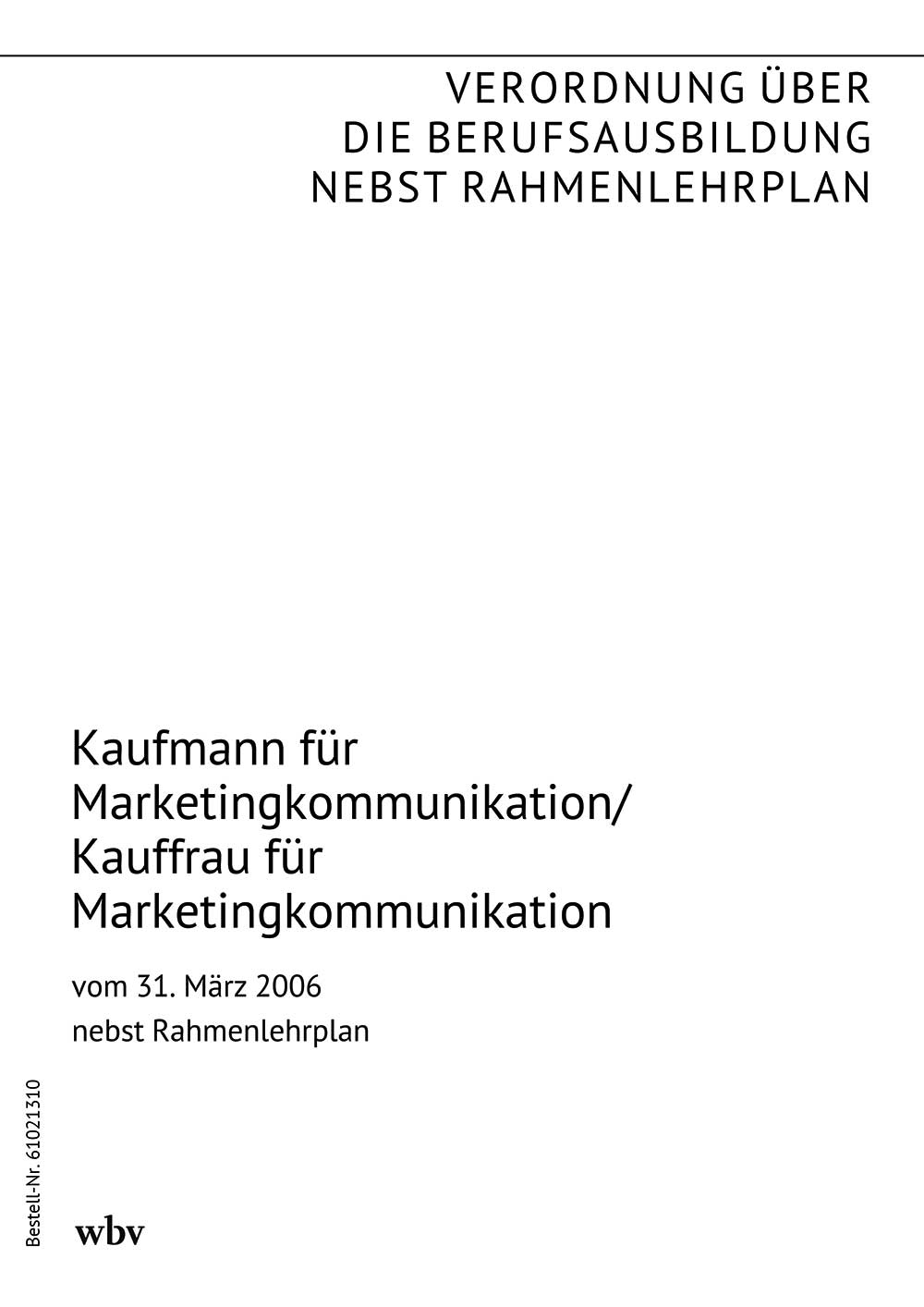 Verordnung über die Berufsausbildung zum Kaufmann für Marketingkommunikation/zur Kauffrau für Marketingkommunikation vom 31. März 2006 (BGBl. I S. 808 vom 13. April 2006) nebst Rahmenlehrplan (Beschluss der Kultusministerkonferenz vom 8. März 2006)