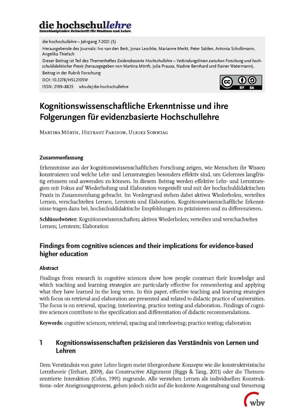 Mörth, M., Paridon, H. & Sonntag, U. (2021). Kognitionswissenschaftliche Erkenntnisse und ihre Folgerungen für evidenzbasierte Hochschullehre. die hochschullehre, Jahrgang 7/2021. Bielefeld: wbv. DOI: 10.3278/HSL2105W